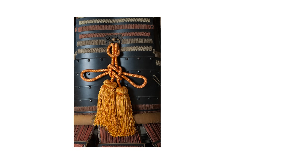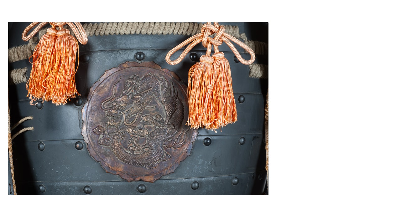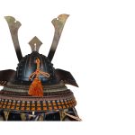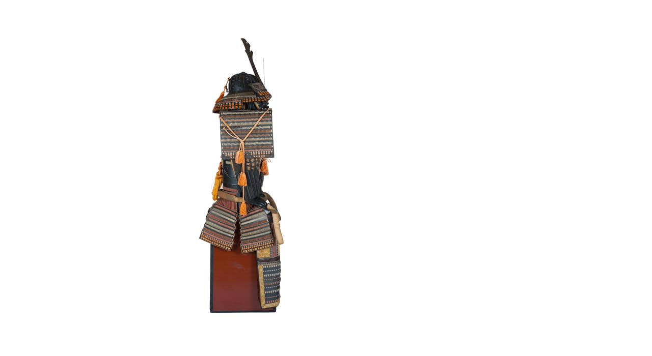 Данный комплект представляет собой детально выполненную современную декоративную реплику-имитацию самурайских доспехов тосэй-гусоку периода Адзути-Момояма (1568-1600) – Эдо (1600 – 1868) с отдельными антикварными деталями. Доминирующий цвет – черный. Комплект состоит из стандартного набора составных частей доспеха тосэй-гусоку, формой и конструкцией полностью соответствующих историческим образцам: шлема хоси-кабуто с надшлемным украшением маэ-датэ в виде «рогов» кувагата со стилизованным зерцалом в центре; подшлемной маски мэнгу (мэмпо) с пришнурованными к ней пластинами, защищающими горло; кирасы в стиле ёкохаги-окэгава-до мунэ-атэ со шнуровкой в стиле сугакэ-одоси со шнурами синего, красного и светло-серого (изначально — белого?) цвета; кираса украшена декоративным медальоном с рельефным изображением дракона в (чеканка, резьба по меди); латной юбки гэссэн, пояса ува-оби; двух оплечий осодэ; двух латных нарукавников в стиле сино-готэ; налядвенника хайдатэ и поножей сунэ-атэ. К комплекту прилагается сундук для хранения ёрои-бицу с иероглифом 前 маэ («находящийся впереди») на передней стенке. Большинство элементов доспеха выполнены во второй половине ХХ века из современных материалов, имитирующих традиционные: дюраль (вместо стали), искусственная кожа (вместо копченой оленьей кожи), бархатная бумага (вместо кожи эгава), современные синтетические пигменты вместо традиционного лака уруси и т.д. К антикварным деталям относятся некоторые декоративные детали канамоно (медальон с изображением дракона), а также черепаховые застежки кохадзэ. Для украшения отдельных частей доспеха используется декоративный узорчатый тканый шелк (парча) современной работы, а также шелковые шнуры с декоративными кистями (красного и золотого цвета). Данный комплект декоративных доспехов предназначен для украшения интерьеров.
