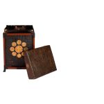 Из надписи красной тушью на коробе для этого доспеха, которая гласит: «Доспех Вакэбэ Дзэндзиро из княжества Оомидзо», можно заключить, что этот доспех был собственностью Вакэбэ Мицудзанэ. Дзэндзиро – это его детское имя. Вакэбэ Мицудзанэ (1756-1808) был восьмым князем княжества Оомидзо в провинции Оми. Княжество состояло из уездов Ясу и Такасима и давало годовой доход в 20 тысяч коку риса. Мицудзанэ жил в Оомидзо и достиг положения, при котором ему дозволялось ожидать сёгунского приема в «Ивовой комнате» (Пост Янагимадзумэ) и имел репутацию спокойного, уравновешенного и тихого правителя. Он построил в своем замке княжескую школу для совершенствования детей самураев, преподавая им разные добродетели и науки, а также упорядочил финансовую систему княжества, ведя крайне экономную политику. Любил искусство и поэзию и даже имел свой творческий псевдоним в мире сочинителей хайку – Сэйхо. Кроме того, занимался и чайной церемонией. Данный доспех стоит охарактеризовать как покрытый черным лаком Иёдзанэ нимайдо гусоку. С одной стороны, он создан так, чтобы его можно было эффективно использовать в реальном бою, но, с другой, он модный и изящный с виду, о чем свидетельствует отделка желтой тесьмой и цветочный узор на наплечниках и назатыльнике-сикоро. Кроме того, доспех находится в великолепной сохранности, как и должен находиться доспех настоящего князя. Есть запись о том, что уже после смерти Мицудзанэ, в 1809 году, был проведен ремонт набедренников-хаидатэ, а также внутри короба есть надпись, сообщающая о том, что доспех надевали во время прибытия американской миссии коммодора Перри в 1853 году. Судя по всему, доспех использовал одиннадцатый глава княжества, Вакэбэ Мицусада (1816-1870). Шлем состоит из 62 пластин, окрашен «под ржавчину», относится к типу кобоси (с пупырышками). Подпись не удается установить. Короб сделан в виде переносной бамбуковой корзины, есть командный жезл с отрезками бумаги (сайхай), набедренная повязка из темно-синей конопляной ткани, большой и маленький отрез ткани для завертывания фуросики синего цвета. Данный комплект доспехов непосредственно связан с конкретными историческими деятелями периода Эдо, а именно Вакэбэ Мицудзанэ и Вакэбэ Мицусада, 8-м и 11-м князьями домена Омидзо, а также с конкретными историческими событиями, оставившими значимый след в истории Японии. Ввиду того, что подобных доспехов с документированной историей сохранилось очень мало, данный комплект является антикварным раритетом и имеет большую культурно-историческую, музейную и этнографическую ценность.