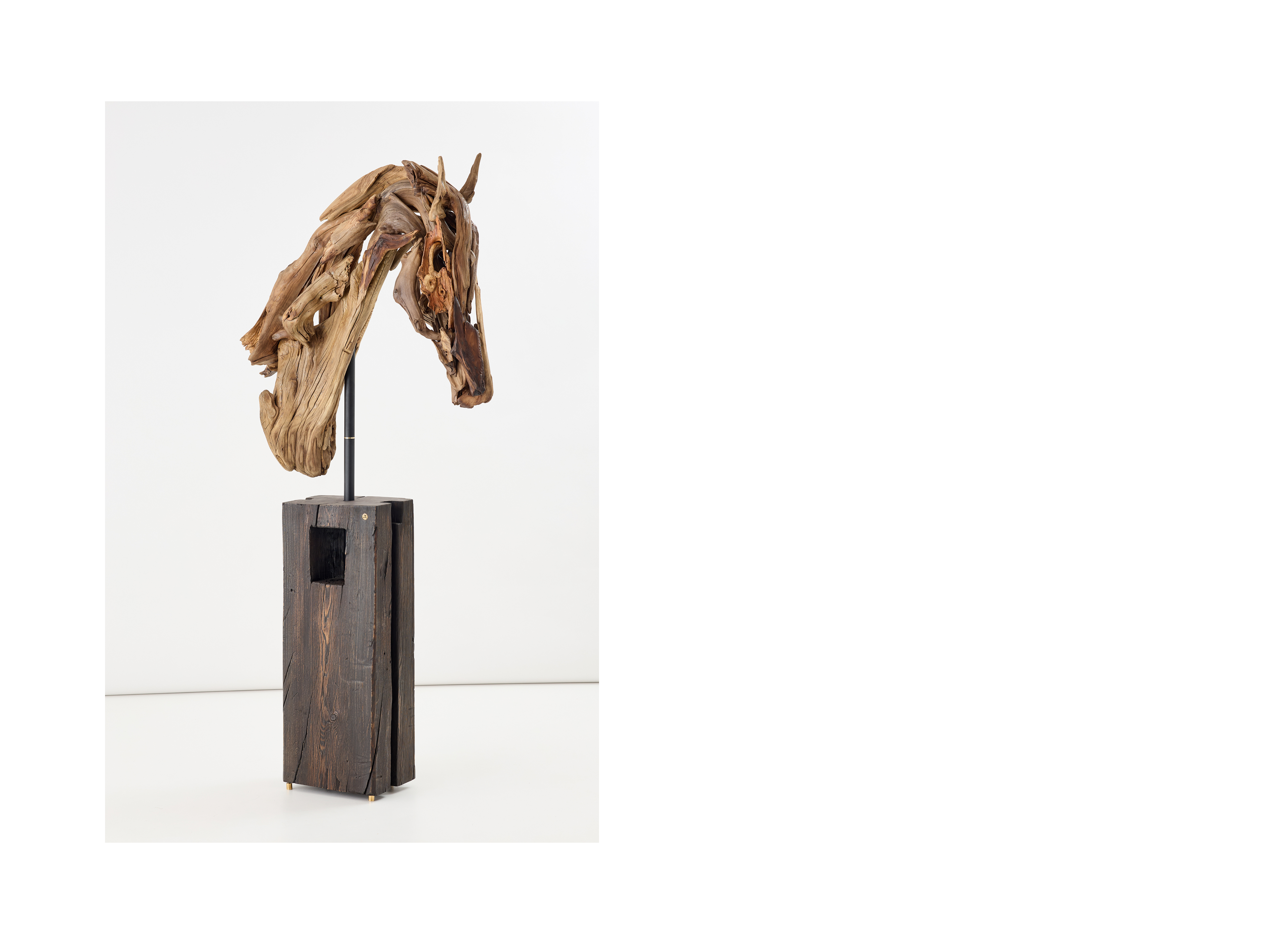 Скульптуры Игоря Роговского созданы из фрагментов дрейфующего дерева и воротных столбов, утративших свое изначальное назначение, но сохранивших в себе память поколений и связь с истоками. Композиция «Голова коня» составлена из 24 фрагментов дерева-плавуна, среди которых несколько мощных корней, позволяющих почувствовать силу этого грациозного животного. Абстрактные формы, переходящие в узнаваемый силуэт, сообщают заложенное автором «мерцание жизни».