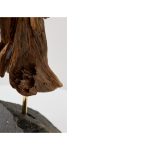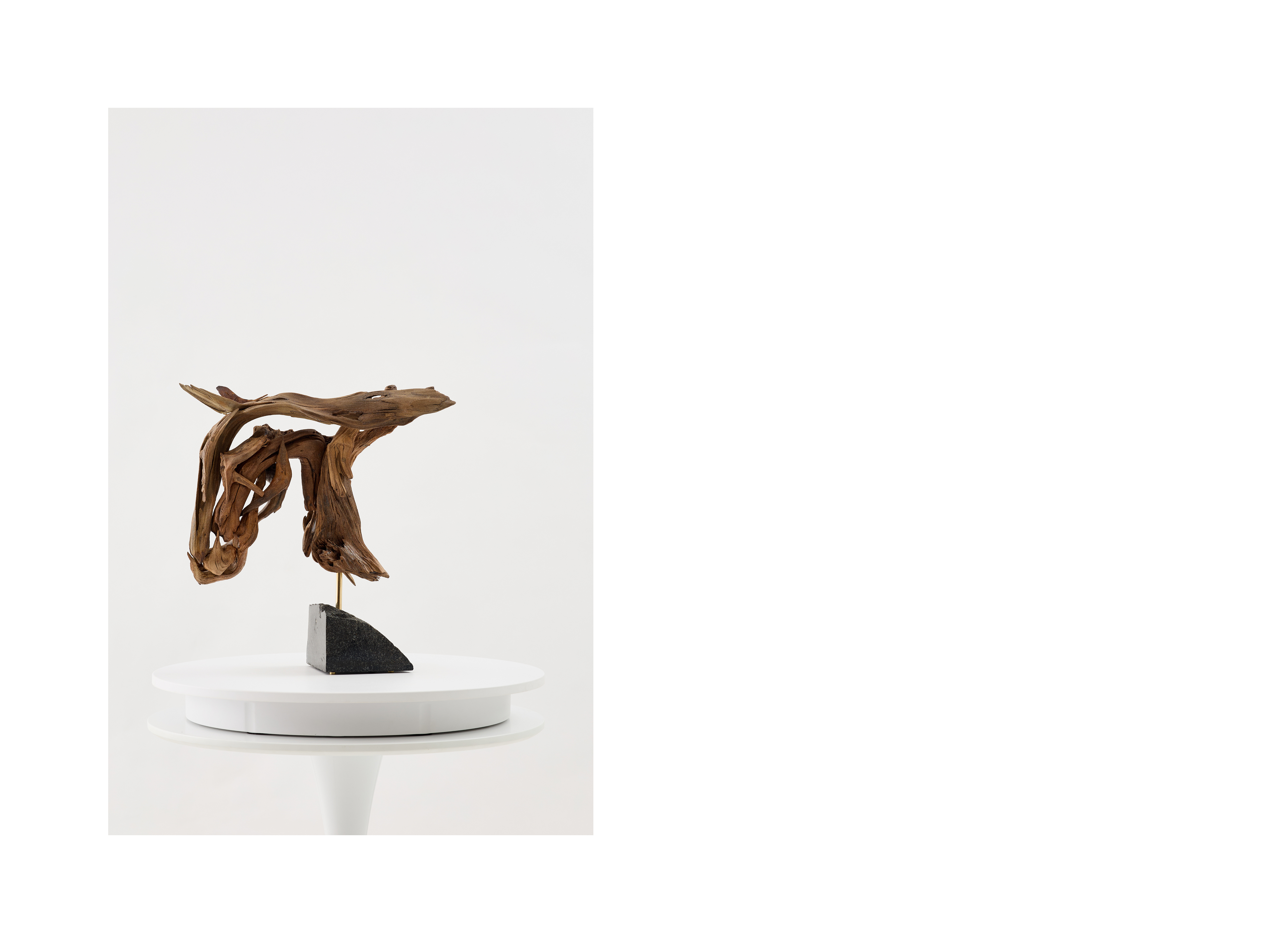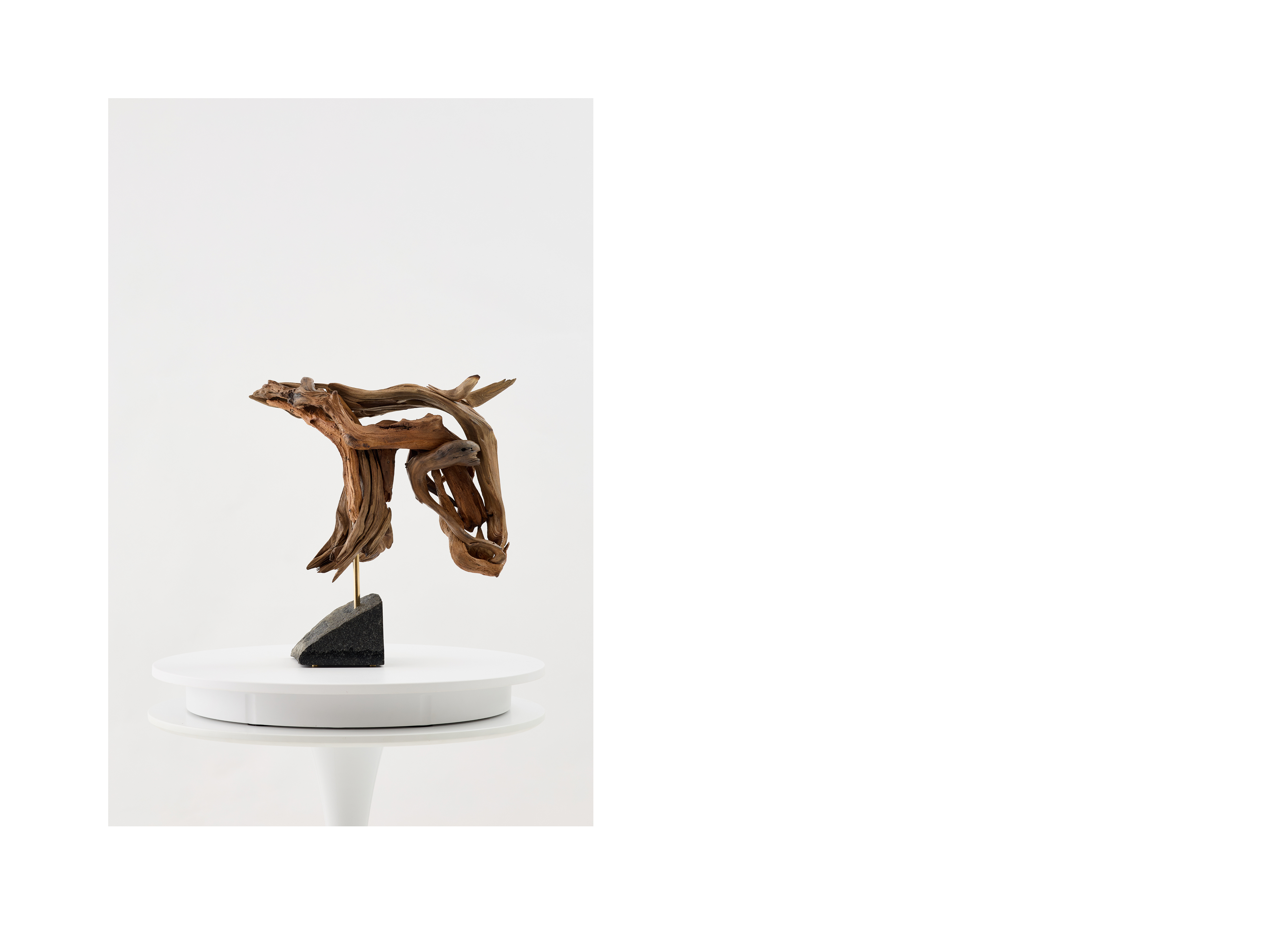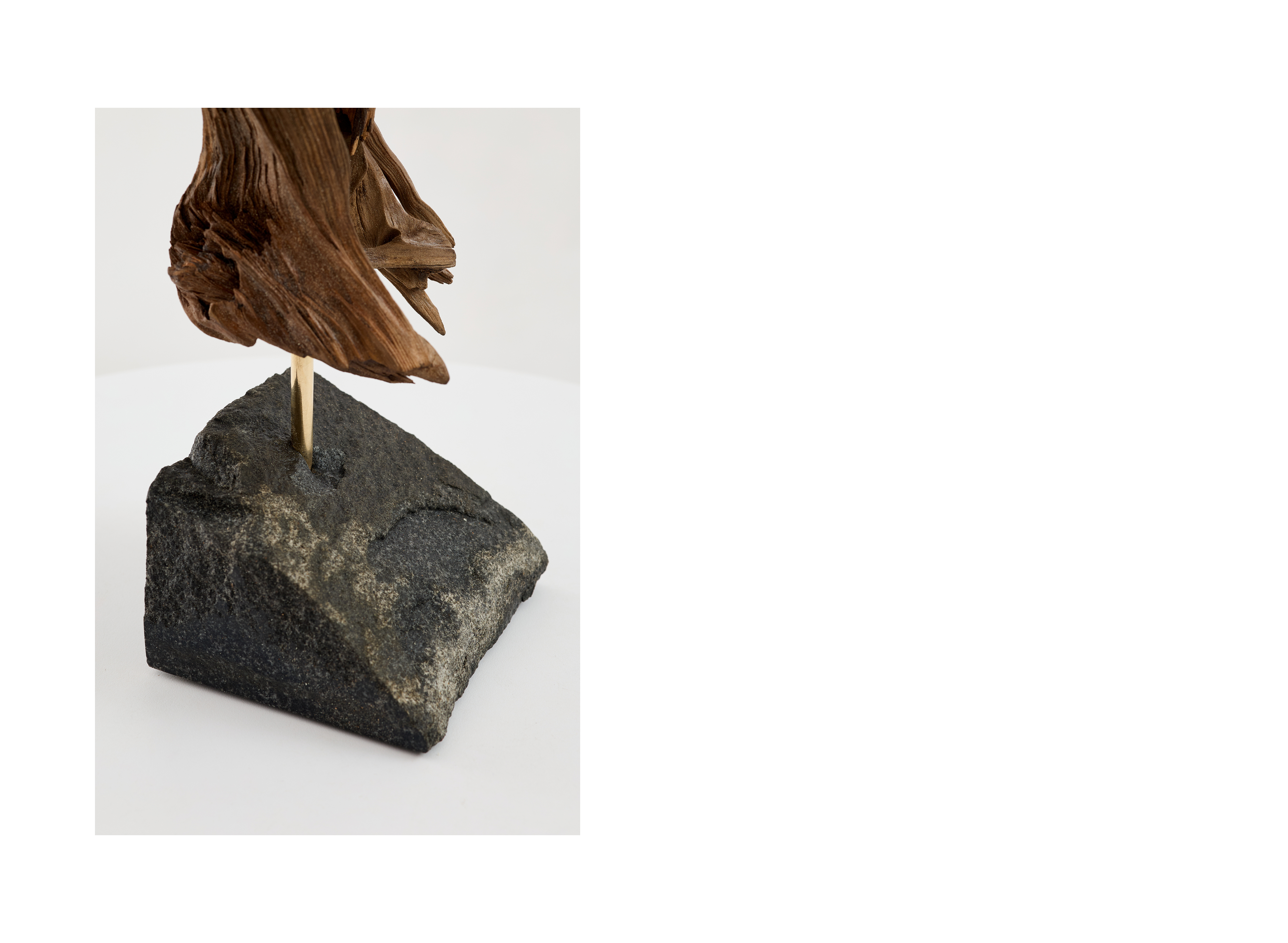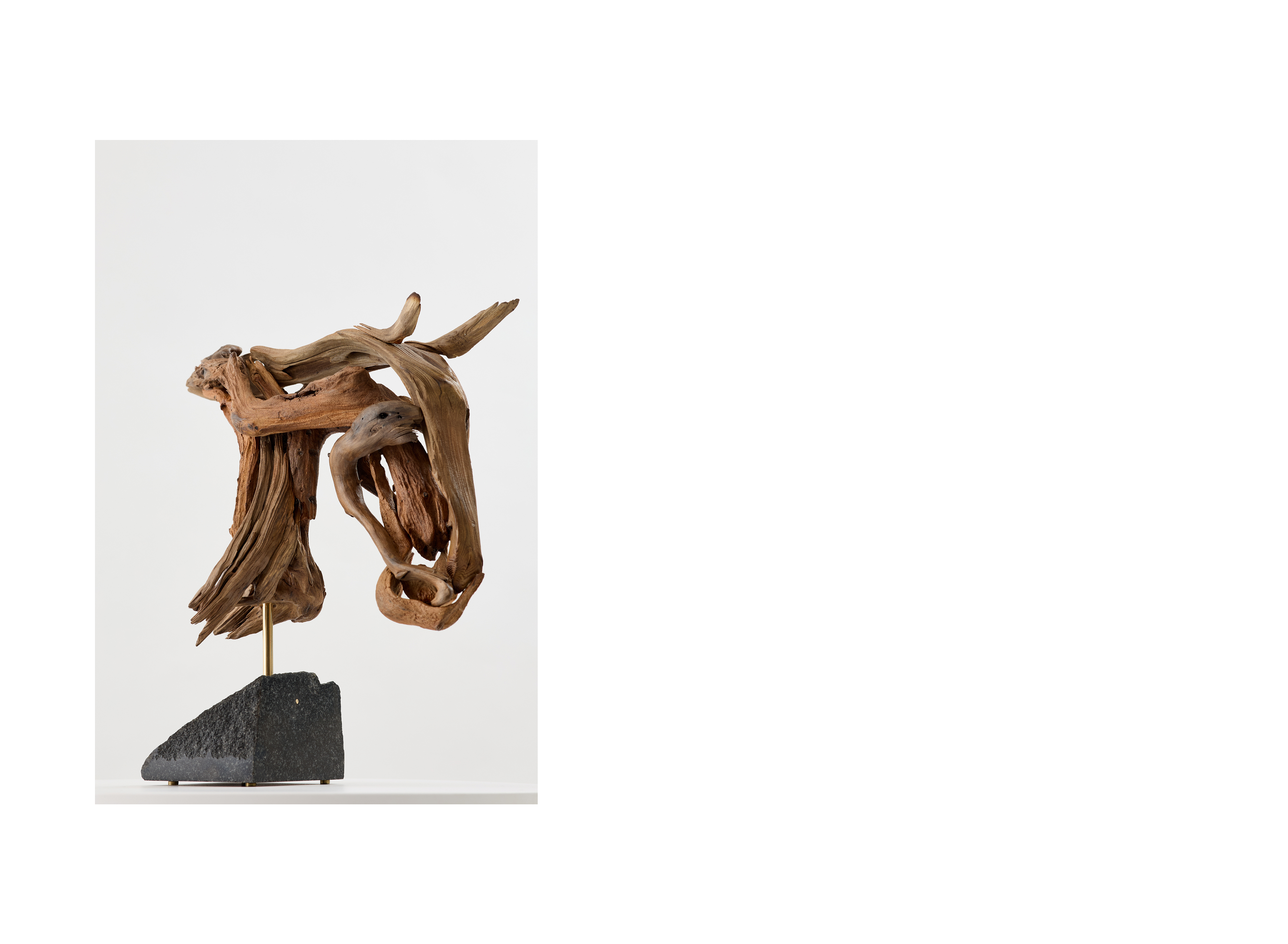 Данная композиция входит в число малых скульптур автора, выполненных в небольшом размере. Технику, которую легко проследить в других, более масштабных работах, автор перенес в миниатюрный формат. В этой серии художник обращается к новым материалам и способом обработки, что стало своеобразным творческим экспериментом. Образ лошади представлен на гранитном основании и легко считывается с разных сторон, благодаря деталям, соединенным в определенной последовательности. Всего для создания было использовано четырнадцать фрагментов древесины разных размеров, идеально подобранных для данного формата. Дерево-плавун, известное также как плавник, в переводе с английского «driftwood» обозначает выброшенные на берег части деревьев. Находясь под воздействием воды древесина становится более прочной, приобретает мягкую обтекаемую форму.