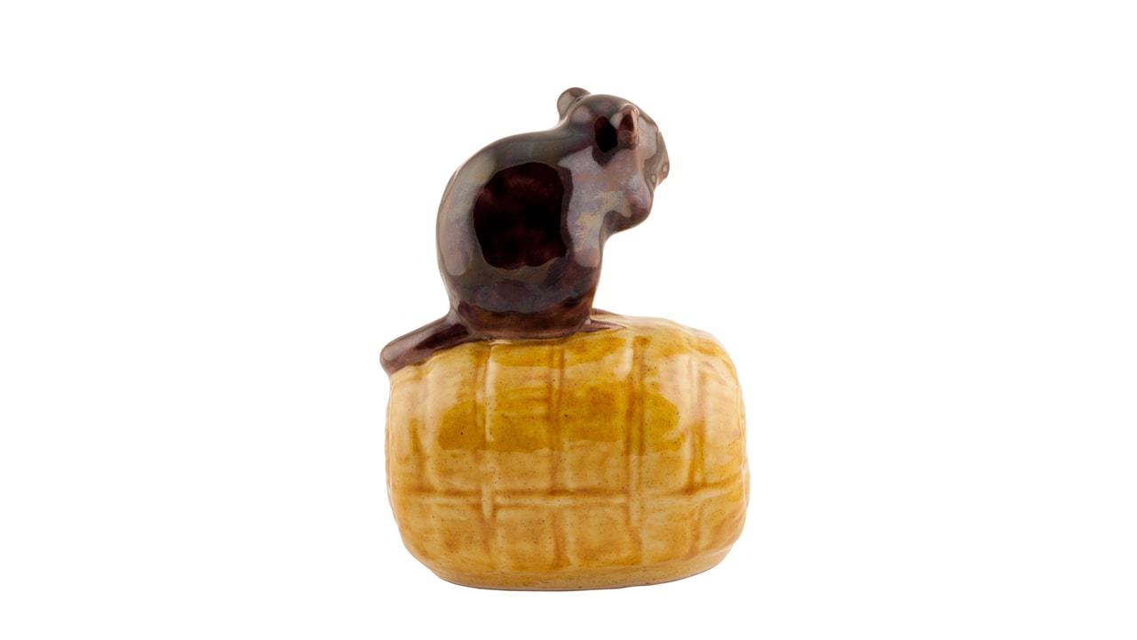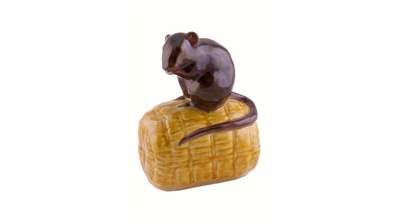 Статуэтка изображает мышь, сидящую на початке кукурузы, фигурку можно отнести к декоративной пластике (керамические и фарфоровые окимоно), широко распространённые в мастерских Японии со второй половины XIX века. Фигура мыши покрыта глазурью коричневого цвета, початок кукурузы — янтарно-желтой. Эти глазури по цвету и текстуре характерны для изделий мастерских Кутани, работающих в стиле ко-кутани («старых изделий Кутани»). По восточным поверьям, образ крысы (мыши) приносит богатство, преуспевание и процветание, ведь они живут только в богатых домах — где есть чем поживиться. Согласно легенде, крыса первой из зверей откликнулась на призыв Будды выразить ему свое уважение в первый день нового года. С тех пор Крыса открывает двенадцатилетний цикл восточного календаря и считается символом дохода.