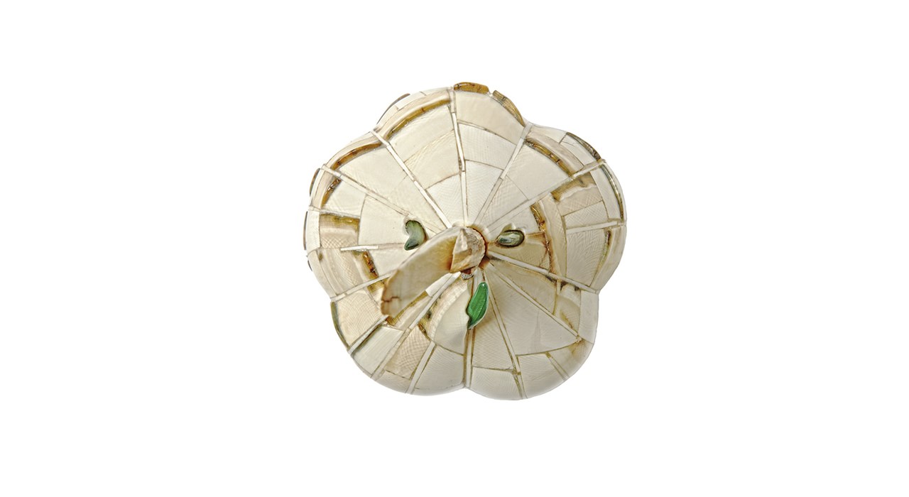 Работа выполнена в редкой технике мозаики, когда каждый кусочек бивня обтачивается отдельно. Сложность данной работы заключается в том, что кусочки имеют неправильную и в то же время выпуклую форму, каждый изготавливается по собственному лекалу. Каждый кусочек мозаики отдельно наклеивается на каркас из красного дерева. Молодые пробивающиеся перья чеснока выполнены из малахита.