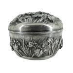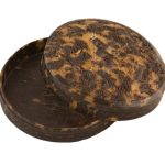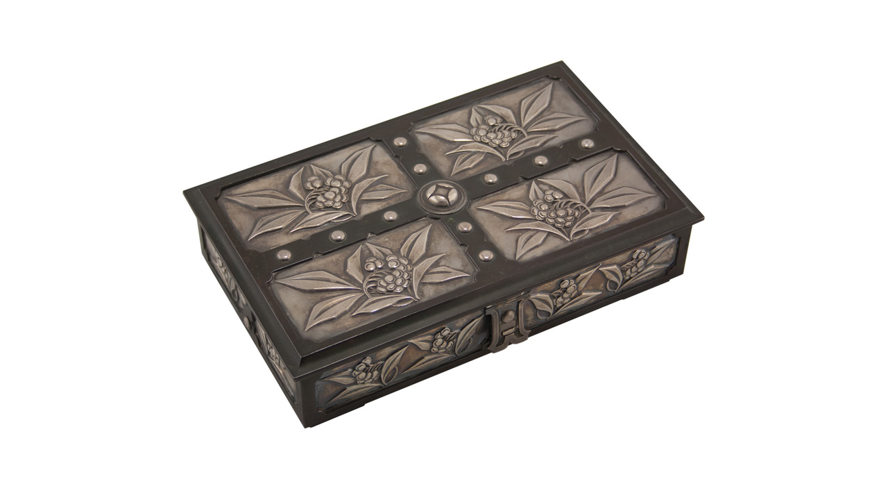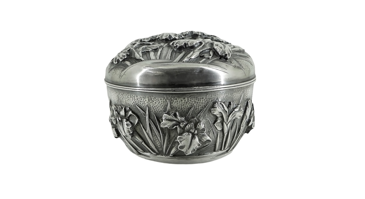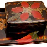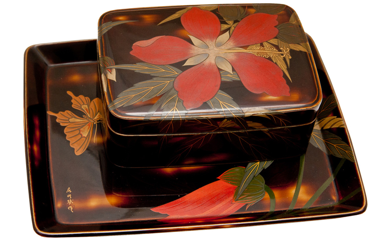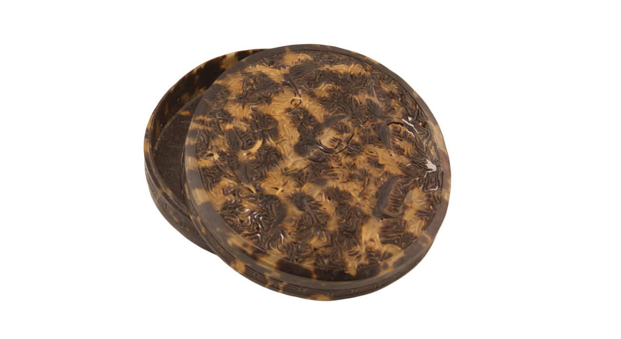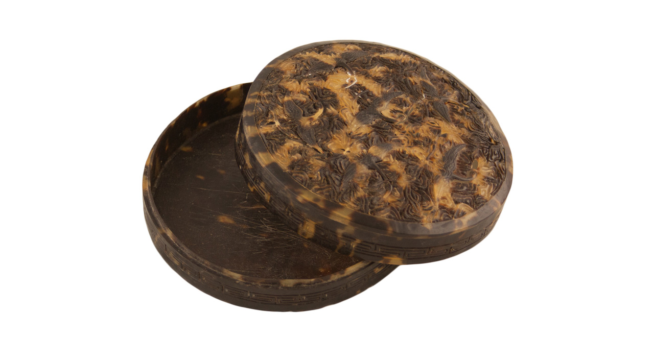 Плоские коробочки подобной формы использовались в традиционной Японии для хранения косметических средств и благовоний. В конце XIX — начале ХХ века пудреницы и коробочки для ювелирных украшений, созданные японскими мастерами, завоевали популярность у западных покупателей. Черепаховый панцирь практически не применялся для бытовых предметов до эпохи Мэйдзи ( 1868—1912 гг. ), так как этот материал был исключительно редким и дорогим (привозился из Китая и стран Юго-Восточной Азии) и попадал под действие