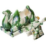 Поверхность декорирована в одной из техник трёхцветной керамики, в данной работе используется 3 цвета: желтый, синий, зеленый. Доминирующая зеленая глазурь образует свободные «потеки» на белой фарфоровой поверхности основы. На первый взгляд, фигура кажется единой, но она содержит в себе секрет – наездник и «седло» являются крышкой со сквозными
