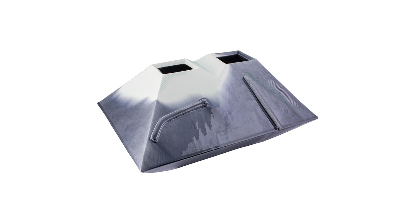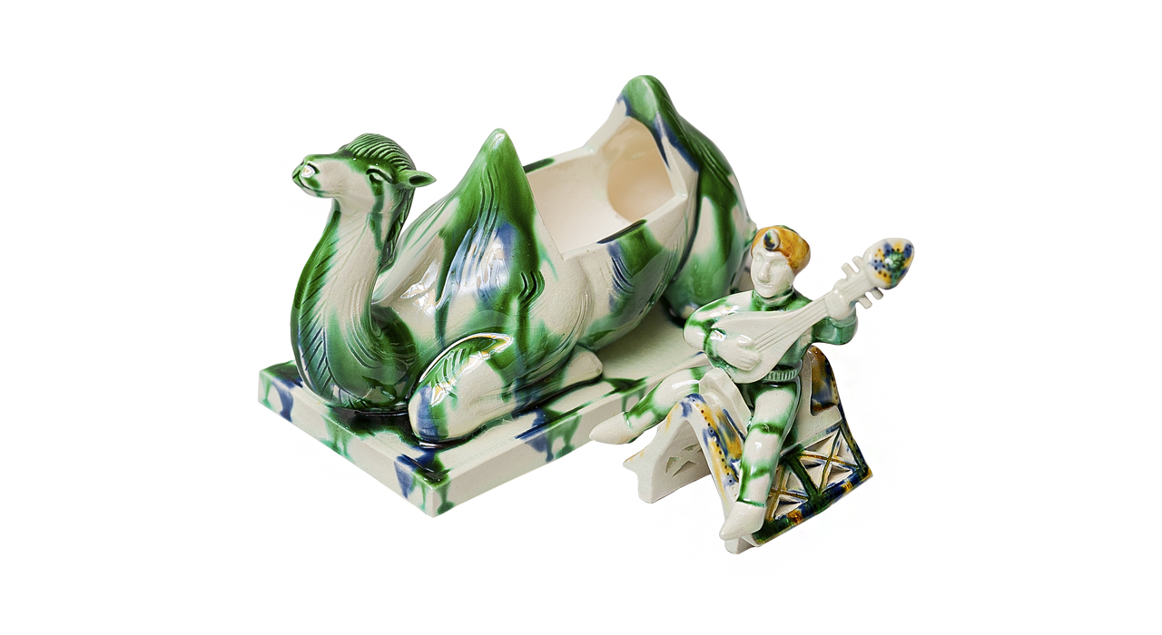 Курильница необычной формы, в виде верблюда с наездником, установлена на керамическую подставку. Поверхность декорирована в одной из техник трёхцветной керамики, в данной работе используется 3 цвета: желтый, синий, зеленый. Доминирующая зеленая глазурь образует свободные «потеки» на белой фарфоровой поверхности основы. На первый взгляд, фигура кажется единой, но она содержит в себе секрет – наездник и «седло» являются крышкой со сквозными прорезями, сквозь которые выходит дым от благовоний, помещенных в основную форму — верблюда. Поверхности мастер придал фактуру – выпуклые линии «шерсти», детали костюма наездника, струны музыкального инструмента. Мотив курильницы навеян арабским арабским Востоком: наездник в тюрбане восседает на верблюде и играет на лютне, традиционном для этого региона музыкальном инструменте.