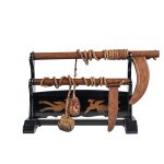 Антикварный тренировочный серп кусаригама. Кама (серп) полностью выполнен из дерева, ударные грузы (фундо) представляют собой текстильные мешки, заполненные песком.