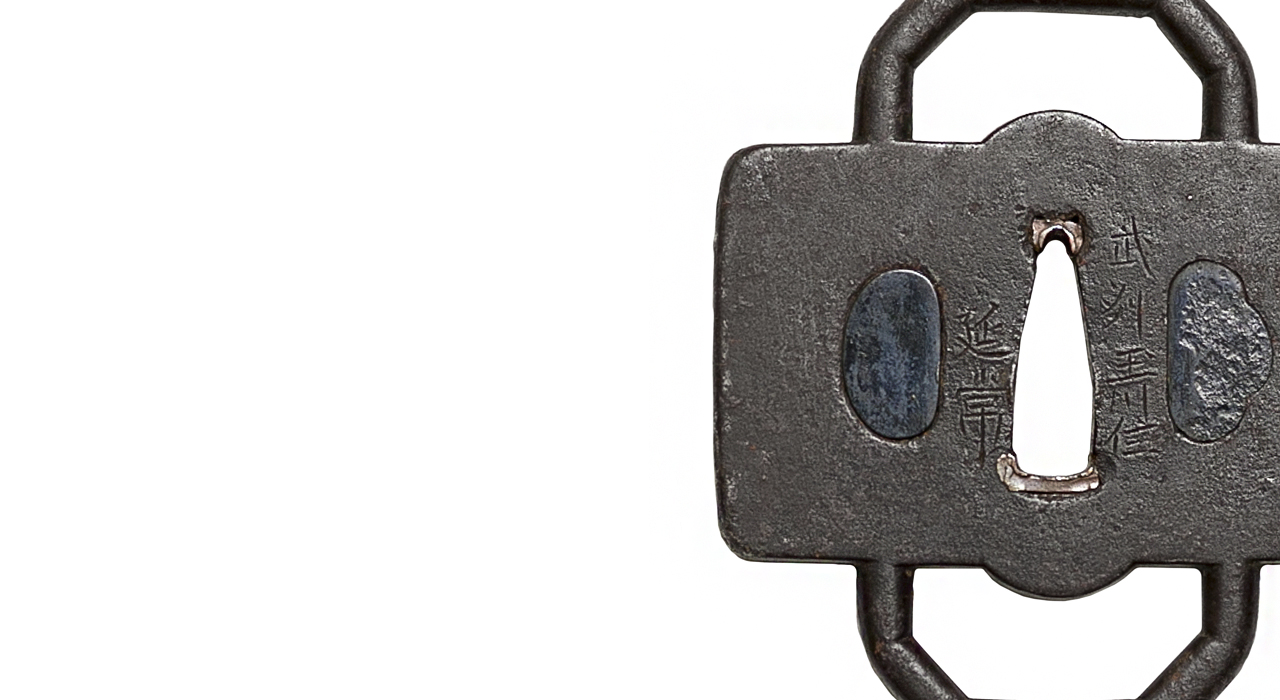 Весьма необычная массивная железная цуба «нестандартной» формы кавари-гата; по-видимому, предназначалась не для меча, а для оправы алебарды (косаря) нагината . Отверстия кодзука-хицу и когаи-хицу запломбированы медными вставками умэ, покрытыми темной патиной. На сэппадай имеется подпись мастера: 武州玉川住延常 Бусю Тамагава-дзю Нобуцунэ — « Нобуцунэ из Тамагава , Бус ю (провинция Мусаси ).