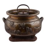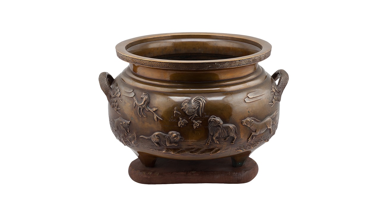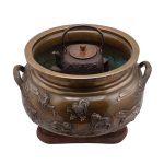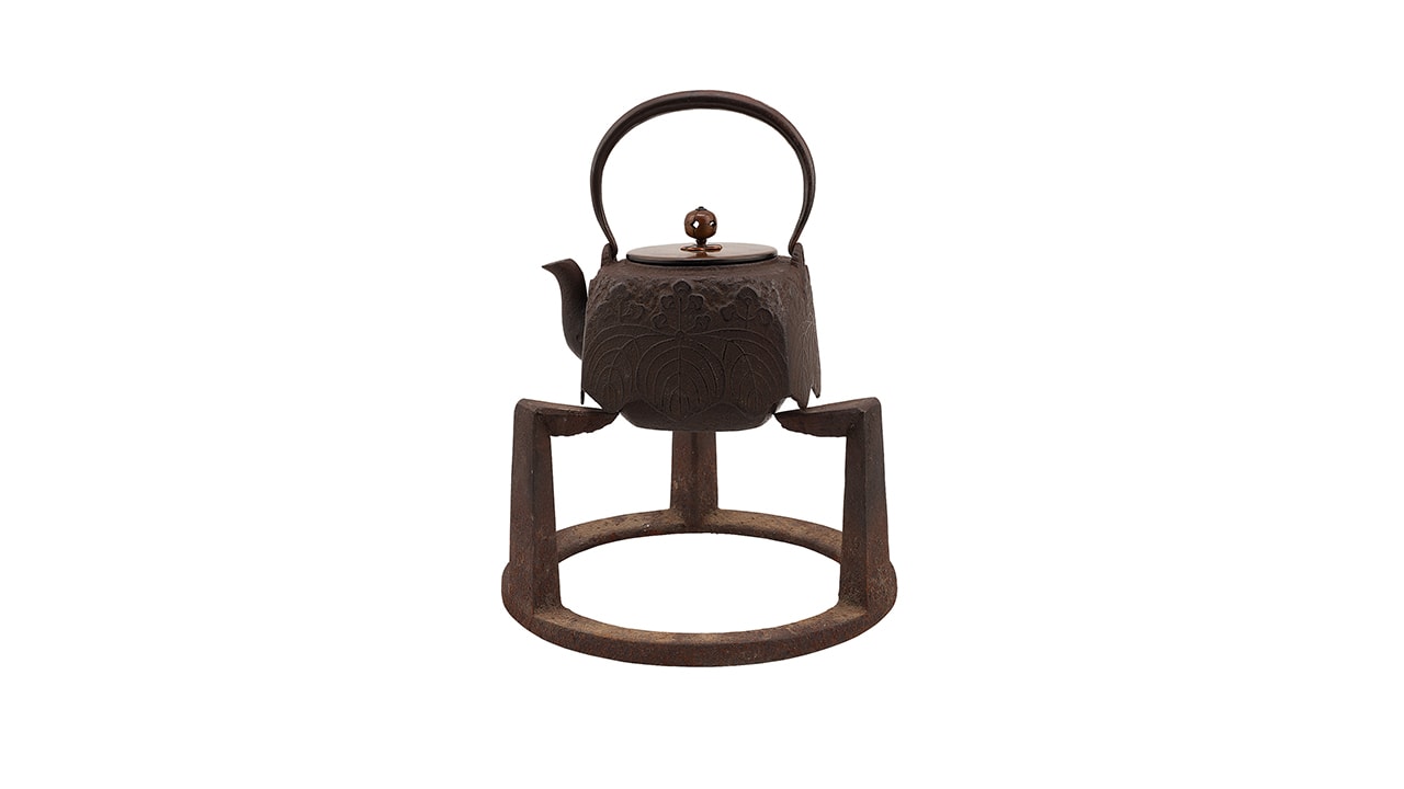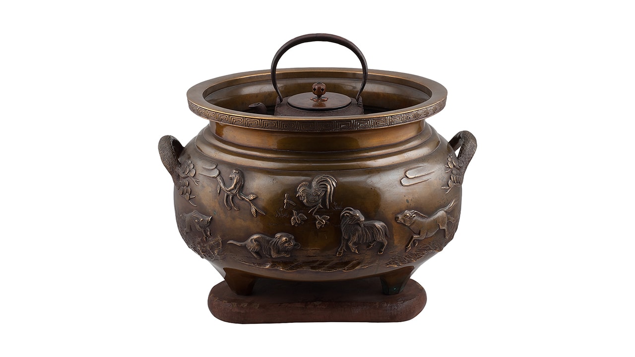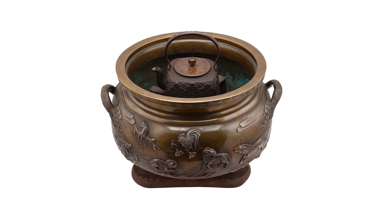 Состав комплекта: Чаша – 1 шт. Треножник – 1 шт. Чайник – 1 шт. Треножник — размер: высота – 13,3 см; ширина – 24,7 см; Хибати: размер: высота – 31 см; диаметр у горла – 36,8 см; максимальный диаметр — 45,5 см