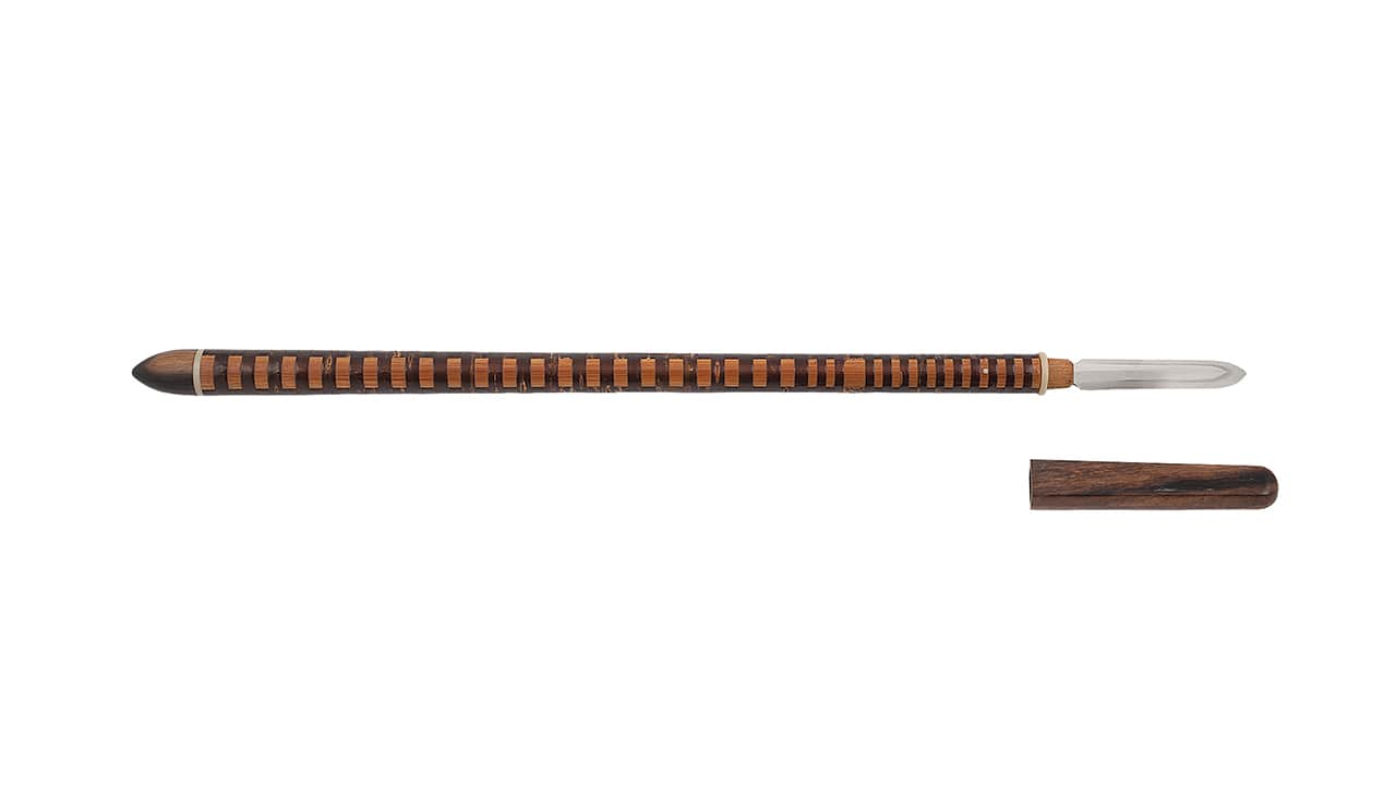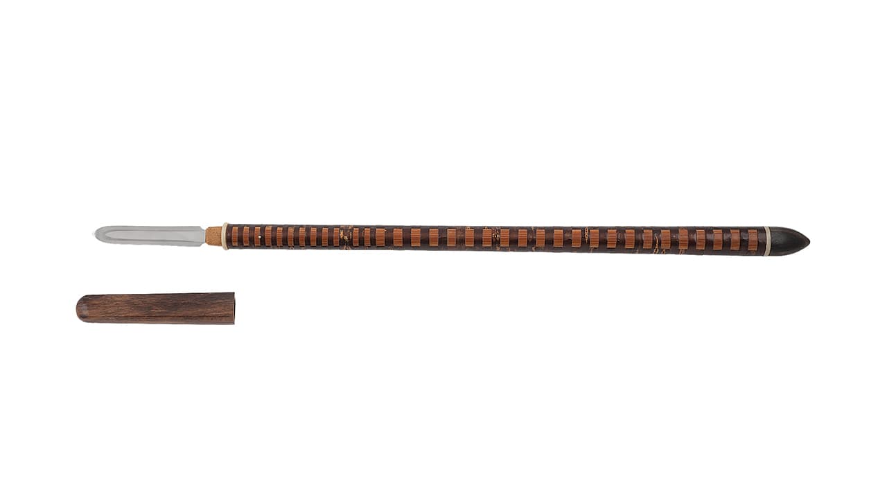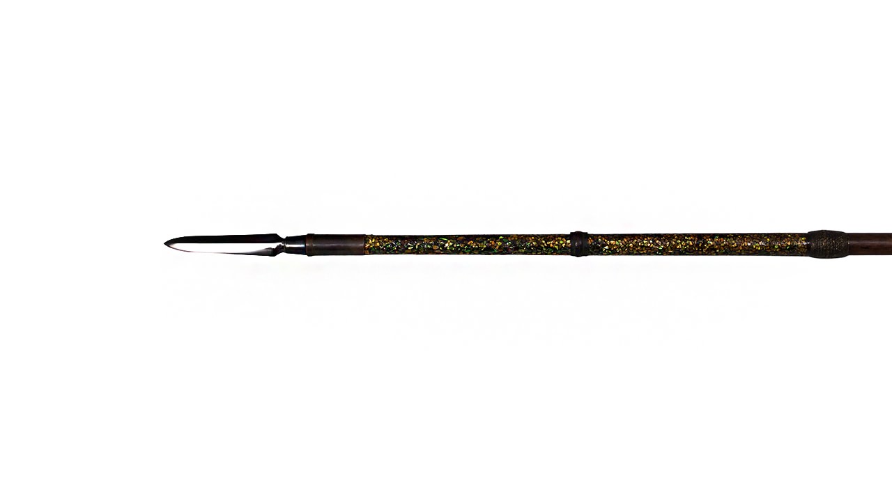 Подток сделан из дерева и отделяется от древка костяным кольцом, аналогичное кольцо имеется под наконечником, играя роль прокладки между ножнами и древком.