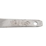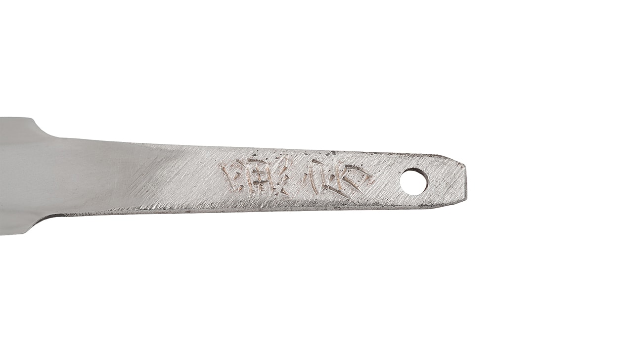 Линия закалки (刃文) наконечника – о-сугуха (大直刃), опиловка хвостовика – судзикай (筋違い), на хвостовике имеется подпись мастера Канэфуса (兼房).
