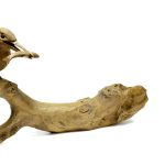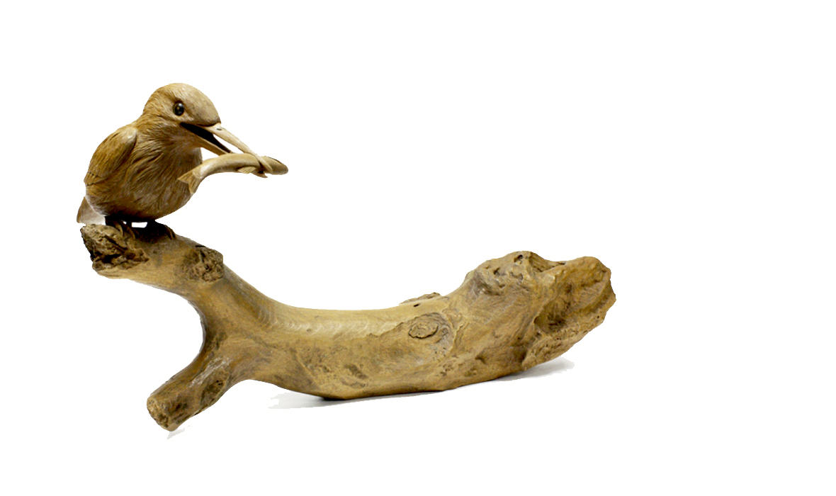 Фигура выполнена из древесины кацура и представляет собой ветку дерева над гладью воды с сидящей на ней птицей.