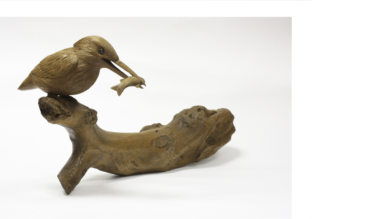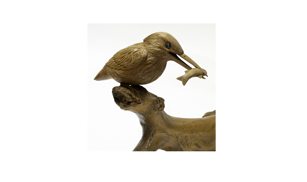 Фигура выполнена из древесины кацура и представляет собой ветку дерева над гладью воды с сидящей на ней птицей. Опытный рыбак, Нарихара Ёсиюки подробно изучил повадки животных и птиц — рыболовов, поэтому живые создания изображены с особой любовью, теплотой и детальностью. Пъедесталом фигуры служит коряга, на которой сидит птичка. Зимородка называют «королевскими рыбаками» или «королями рыбаков» за ловкость в охоте. Зимородок подкарауливает добычу, неподвижно сидя на какой-нибудь невысокой ветке, откуда камнем падает в воду, скрываясь в ней полностью, после чего тут же выныривает и взлетает. Мастер Нахиро изображает в своей работе зимородка после удачной охоты. Для своих произведений мастер выбирает цельные куски дерева кацура, из которых вырезает задуманную композицию. Резьба из цельного куска дерева делает работу очень трудоемкой, но мастер тратит огромные усилия на детальное изображение фигур. Резьба по дереву в Японии является очень древним и одним из самых почитаемых видов искусства. Педантичная работа с деталями характерна для мастеров нэцкэ, но также используется и для работы с более крупными формами.