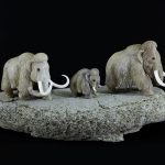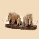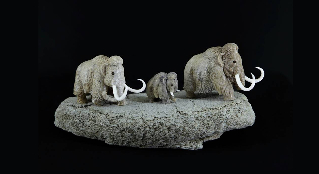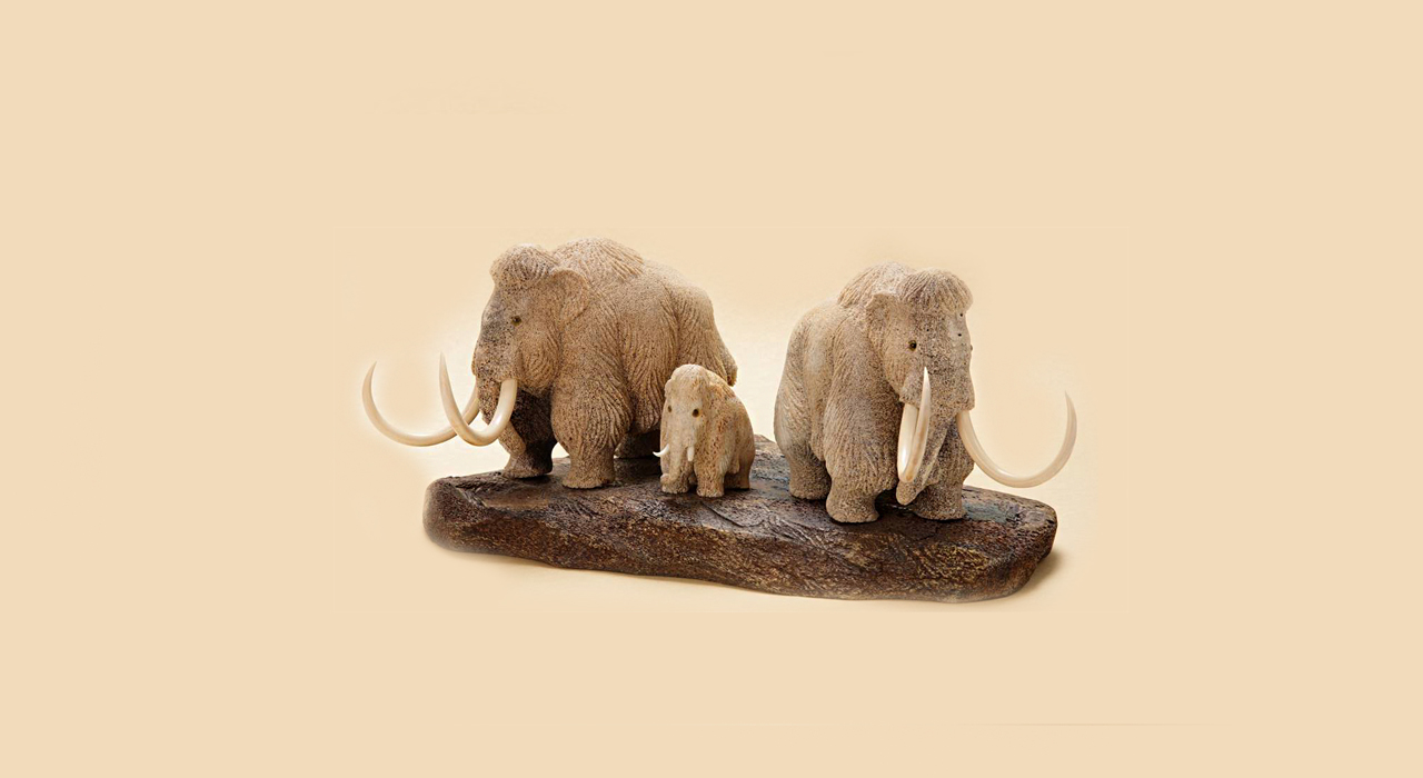 Композиция «Мамонты» выполнена из позвонка кита, мастер изобразил семейство мамонтов – родителей и мамонтёнка — в движении.