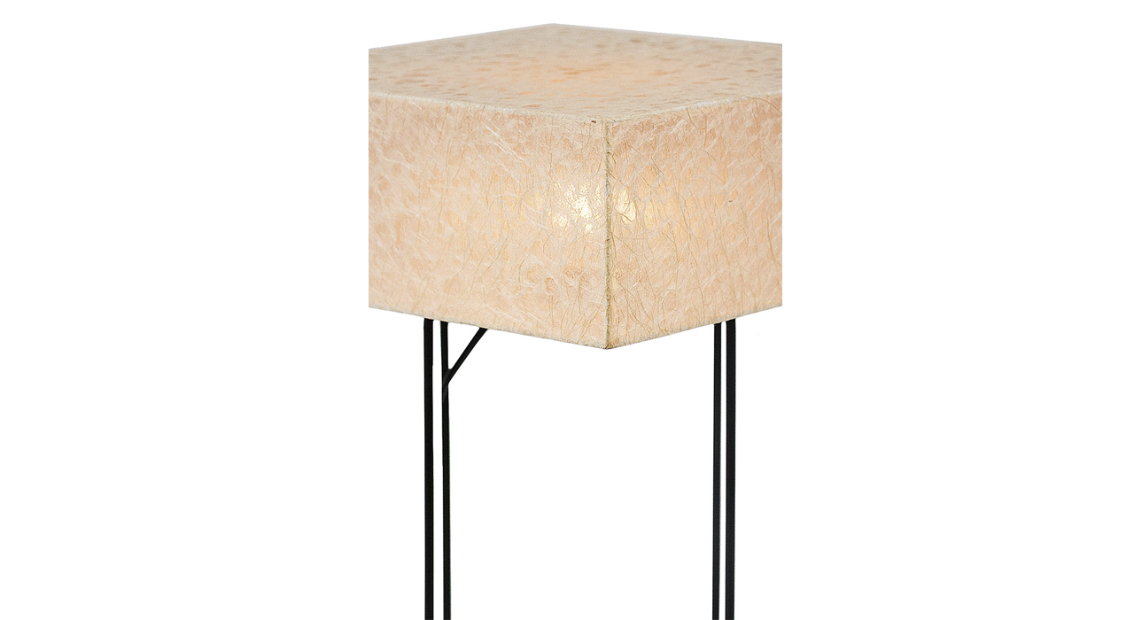 Светильник выполнен в форме прямоугольной призмы с равномерным распределением света по фигуре. Белый цвет и волокнистая фактура бумаги придают