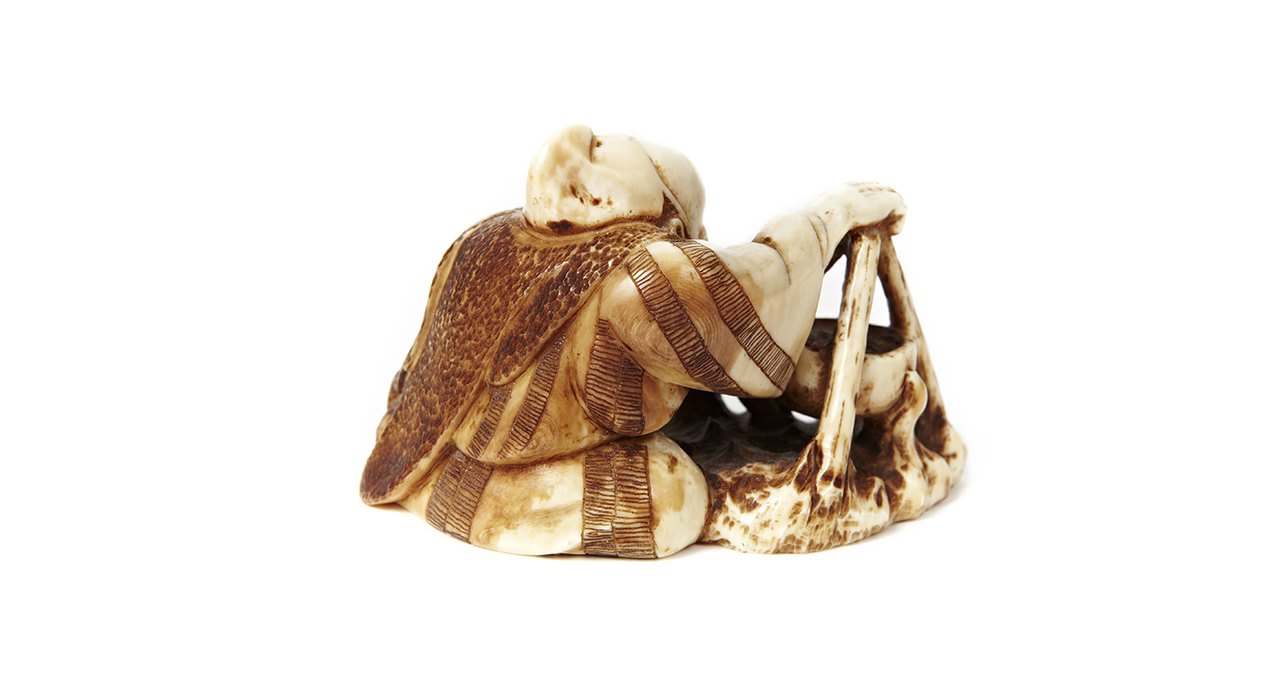 стилизации современного изделия с архаичными нэцкэ ранних школ резьбы по кости. Интенсивный гравированный орнамент с обеих сторон композиции имитирует прием кругового обхода, при котором тщательно прорабатываются все детали для достижения пластичности. Обильное чернение и использование гравировки характерно для мастеров эпохи Эдо.