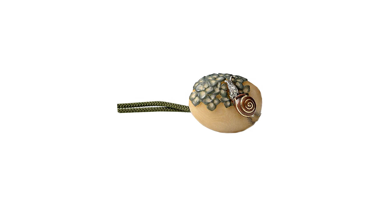 Миниатюрный резной брелок с декором в виде цветков голубой гортензии и ползущей по ним улитке. Основа изделия выполнена из семян ореха тагуа, известных в мире как «растительная слоновая кость» благодаря своей прочности. В традиционной японской одежде не было карманов, поэтому небольшие вещи клали в особые ящички — инро, которые закрывались с помощью бусины, скользившей по шнуру (одзимэ). Инро крепились к поясу кимоно (оби) с помощью шнурка — его связывали в кольцо, складывали пополам и пропускали через пояс. К одному из концов получившейся петли крепили фигурку нэцкэ, которая служила одновременно и своеобразным противовесом инро, и изящным украшением костюма. В буддизме улитка — символ терпения и стремления к благим намерениям, по учению фэн-шуй образ улитка приносит счастье и спокойствие. А цветок голубой гортензии в японских стихах изящно описан как «солнце цвета индиго».