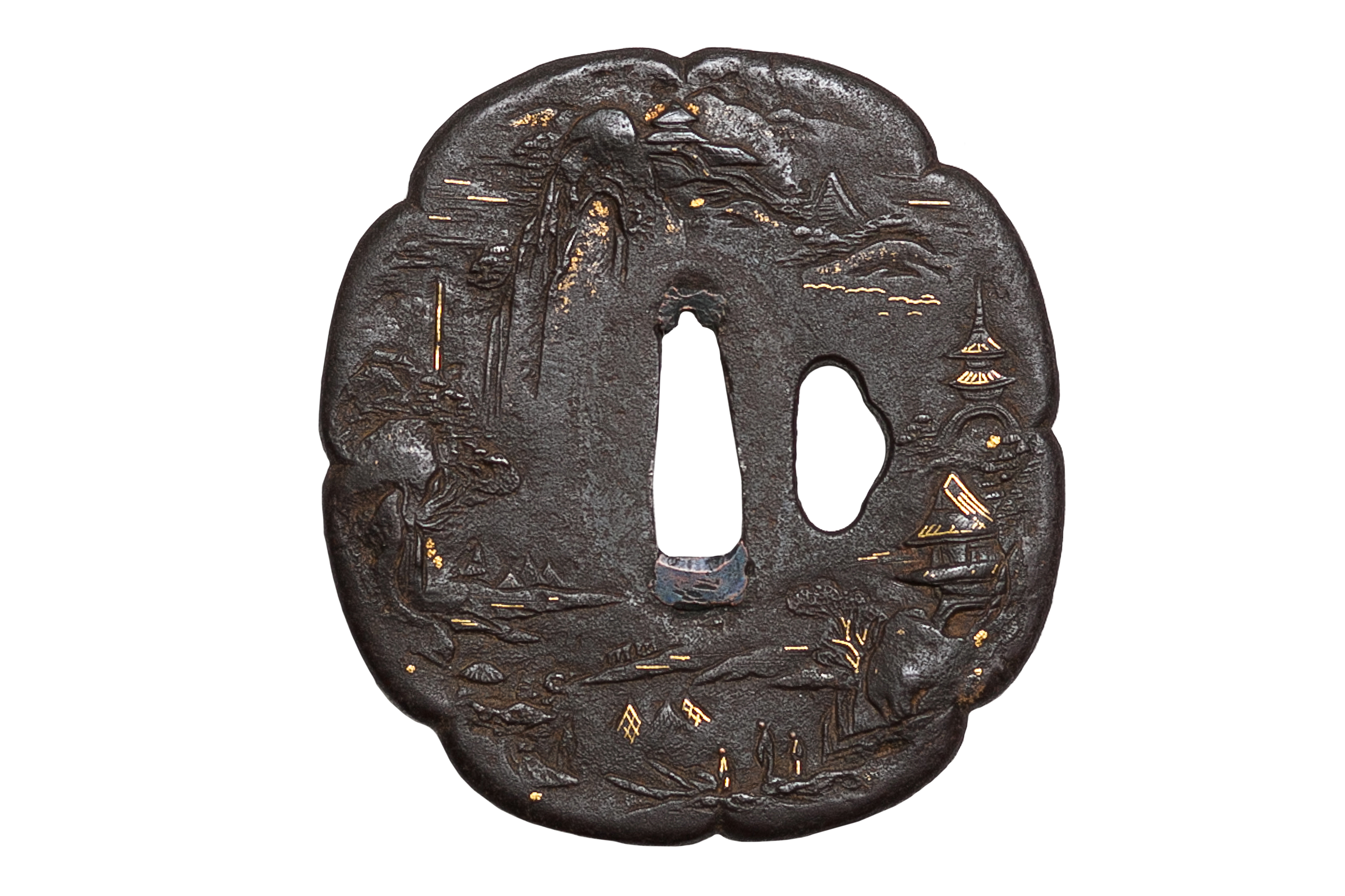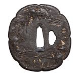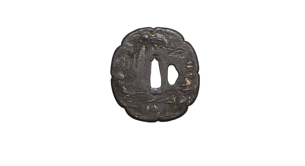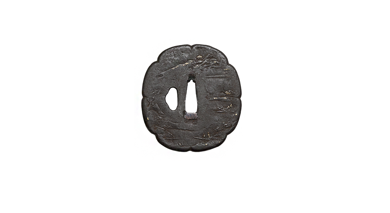 Неподписанная железная цуба в стиле школы Айдзу-Сёами , формы яцу-мокко (цветок дыни с 8 лепестками), с одним отверстием когаи-хицу . Декоративный мотив – миниатюра-пейзаж в стиле монохромной живописи «горы и воды» в китайском вкусе (горы, облака, водопады, скалы, крыши пагод и храмов, сосны, рыбачьи лодки) выполнен в комбинированной технике (художественная ковка, резьба в высоком и низком рельефе, инкрустация золотой проволокой и фольгой, патина).