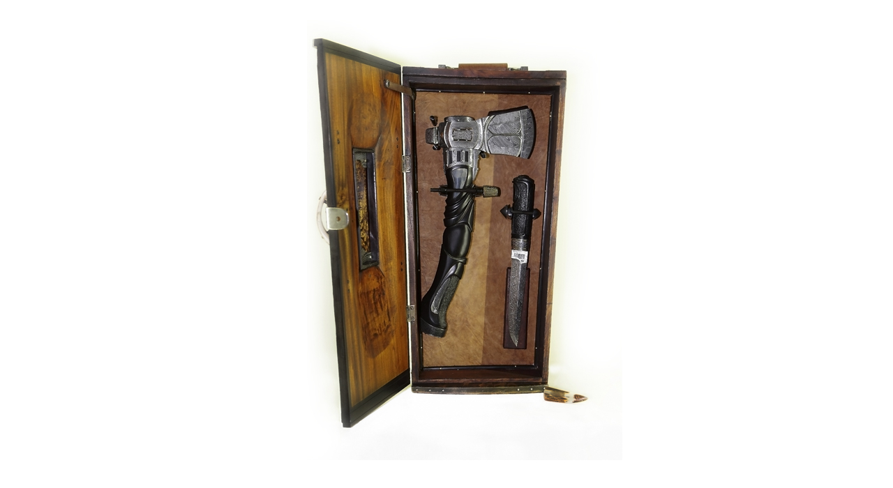 Размеры: Топор: Длина топорища — 360 мм Высота топора — 178 мм Длина лезвия – 85 мм Нож: Общая длина — 282 мм Длина клинка — 127 мм Ширина клинка — 24 мм Материал: Короб: внешняя сторона коробки – кап сосны, внутренний каркас коробки – древесина ясеня, дубленая кожа оленей, вставки – арктическая береза, рамки на коробке – эбеновое дерево, замок – кость мамонта, металлические детали – дамаск «кожа дракона», крепежные детали – черное дерево, пластины с гравировкой – патинированная латунь. Топор: лезвие – дамаск «кожа дракона», рамка – золото 18 карат, закрепительная часть — серебро, латунь, рукоять — черное дерево, накладка – выкрашенная в голубой цвет кость мамонта, арматура – дамаск. На обухе – гравировка. Нож: основа для лезвия — заготовка из углеродистой стали, украшение – слой мозаичного дамаска, серебряный хабаки, ручка из черного дерева Вот как сам мастер говорит о своем изделии: «Основной идеей создания этой композиций стало сотворить нечто, не подвластное времени. Я захотел создать такую вещь, как если бы она была найдена на корабле 500 лет назад. Идея для композиции навеяна историями из прошлого. По стилю я хотел максимально приблизиться к древней эре викингов с её довольно грубой культурой и битвами, чтобы гладкая поверхность и элегантность контрастировали с чем-то деревенским и грубым. Моим намерением было создать предметы, явившиеся из прошлого, с использованием материалов из моего скандинавского наследия. Я постарался объединить различные стили, которые нравятся мне в искусстве, такие как арт нуво и японский стиль с элементами древнего шведского фольклора. Реликвия для коллекции знатного человека. Кусочек древней мифологии Севера. Именно об этом я хотел рассказать…»