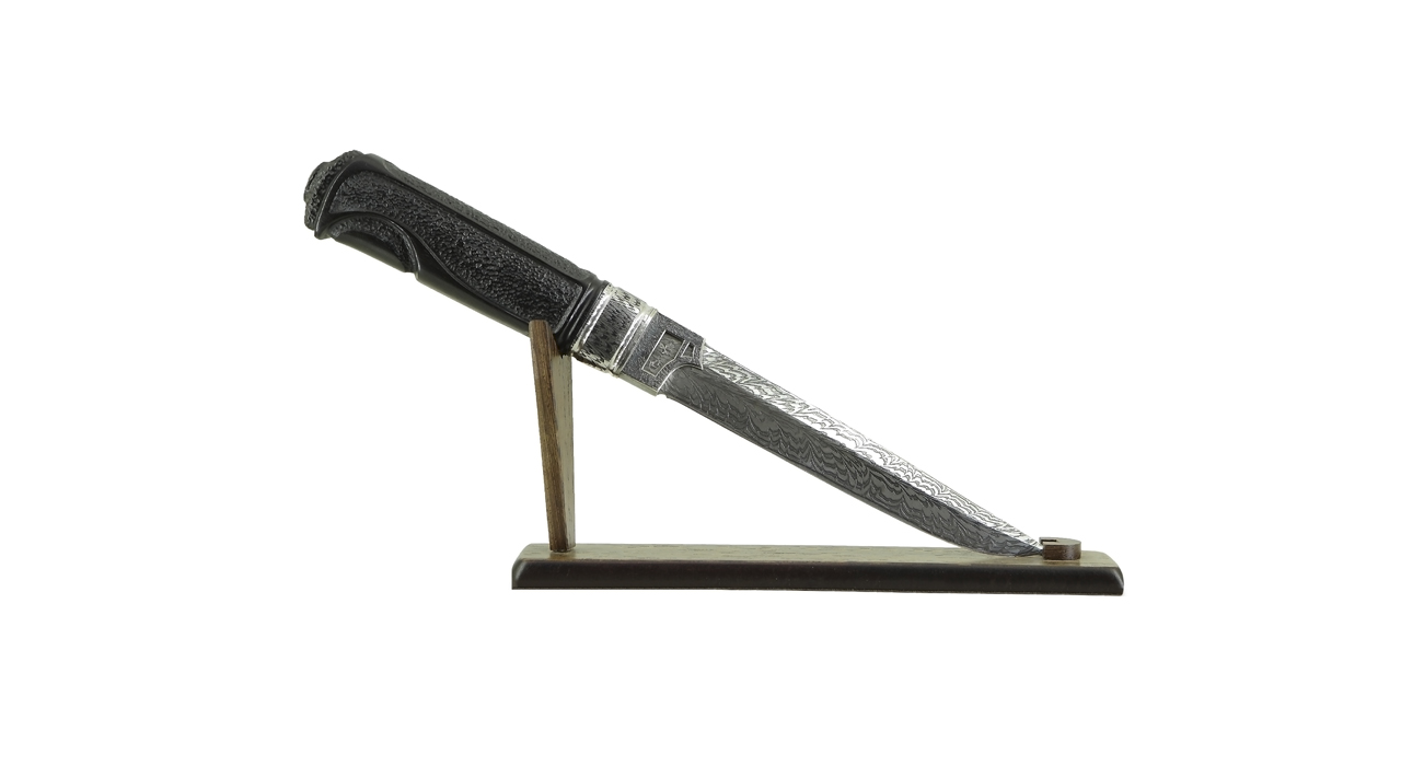 Нож: основа для лезвия — заготовка из углеродистой стали, украшение – слой мозаичного дамаска, серебряный хабаки, ручка из черного дерева