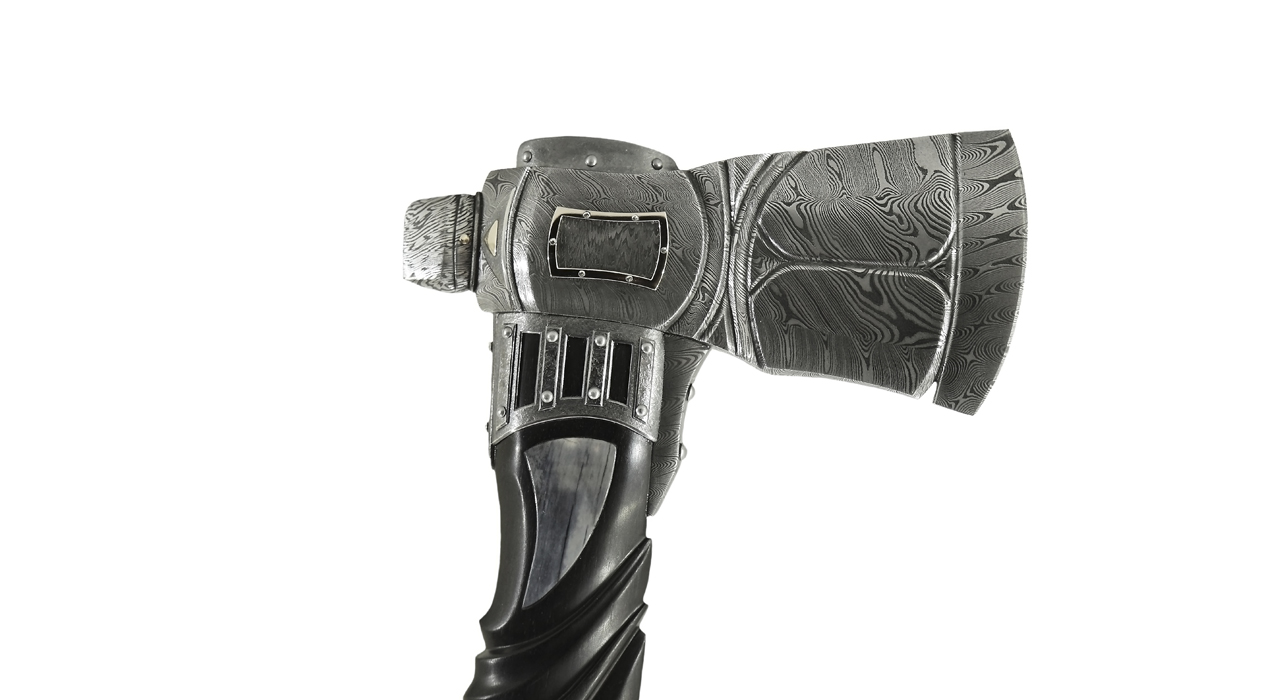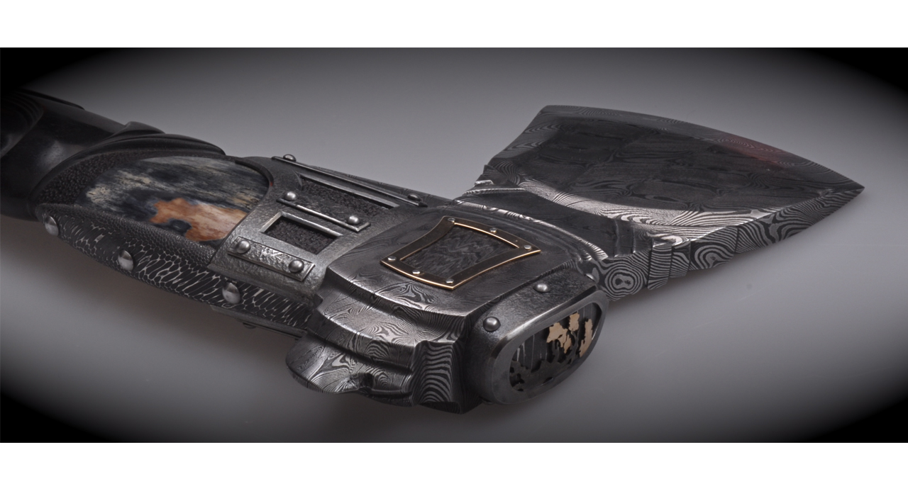 Топор: лезвие – дамаск «кожа дракона», рамка – золото 18 карат, закрепительная часть — серебро, латунь, рукоять — черное дерево, накладка – выкрашенная в голубой цвет кость мамонта, арматура – дамаск. На обухе – гравировка.