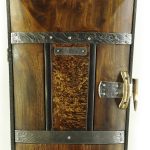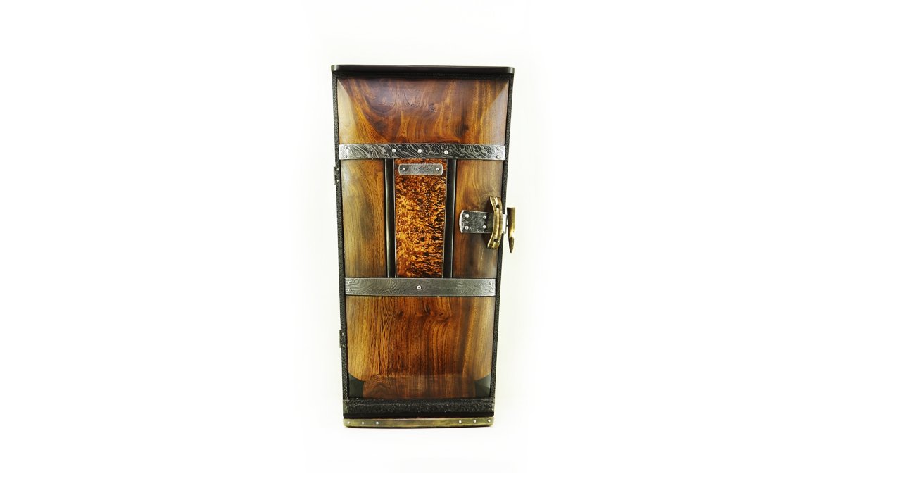 Короб: внешняя сторона коробки – кап сосны, внутренний каркас коробки – древесина ясеня, дубленая кожа оленей, вставки – арктическая береза, рамки на коробке – эбеновое дерево, замок – кость мамонта, металлические детали – дамаск «кожа дракона», крепежные детали – черное дерево, пластины с гравировкой – патинированная латунь.