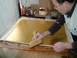 Створки ширмы оформлены золотой фольгой в технике кимпаку, благодаря которой предмет обретает особенное вневременное сакральное свечение.