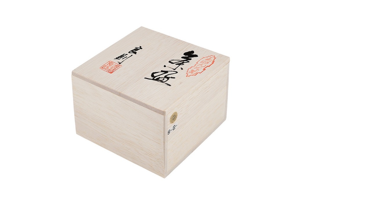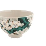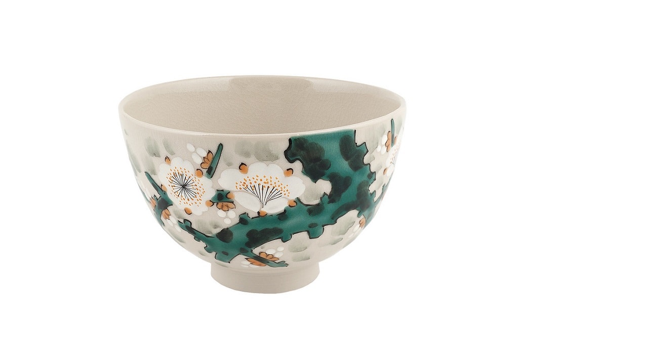 Изящная чаша для маття выполнена вручную, и на ее поверхности изображены цветы белой сливы. Роспись выполнена в стиле Ёсидая. Это стиль печей, открытых богатым купеческим домом княжества Дайсёдзи – семейством Тоёда (название их магазина — Ёсидая). Стиль отражает особенности культуры периода Бунка-Бунсэй и отличается мягкостью линий. Считается, что работы этого стиля наиболее близки к оригинальным произведениям Ко-Кутани и используют, в основном, три цвета – голубой, зеленый и желтый. В качестве тем изображения чаще всего используются цветы и птицы, пейзажи, небольшие утесы и цветочные узоры. Романтическая история сохранения традиции Ко-Кутани-яки на протяжении 350 лет. Первые работы Ко-Кутани-яки развивались, начиная с 1655 года при поддержке глав княжества Дайсёдзи. После того, как рядом с деревней Кутани были найдены залежи особой глины, из княжества Кага был послан Гото Сайдзиро, который прошел у мастеров-гончаров района Арита на Кюсю профессиональную подготовку и открыл свою печь рядом с деревней Кутани. Именно эта дата считается точкой отсчета традиции Ко-Кутани-яки.