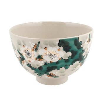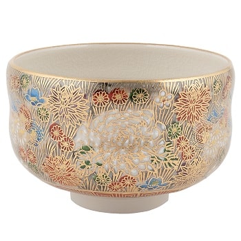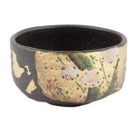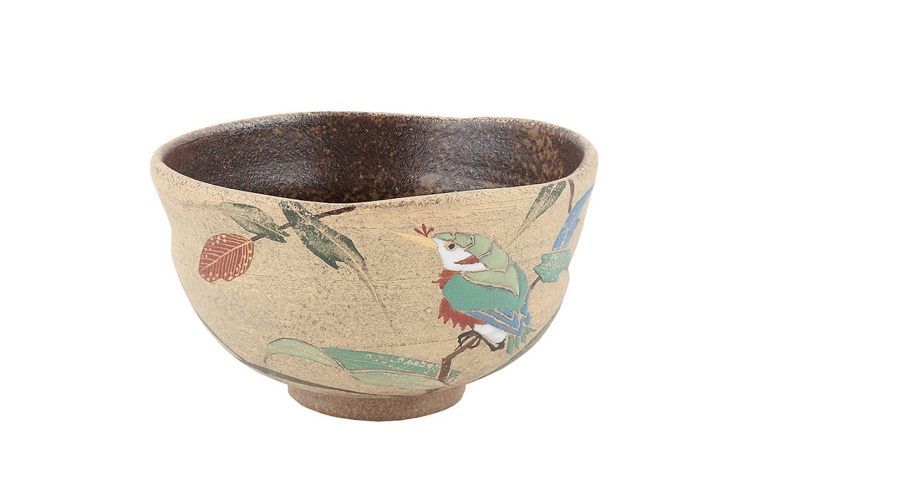 Изящная чаша для маття выполнена вручную, и на ее поверхности изображен маленький зимородок. Зимородок считается одной из самых красивых птиц, пищу он добывает в озерах и реках, поэтому он изображен сидящим в кустарнике на берегу водоема. Роспись выполнена в стиле Юрикинсай (золотой узор под глазурью). В обычном варианте золотой узор краской или кусочками золота наносится поверх глазури, однако в данном стиле кусочки золотой фольги прикрепляются к основе, а потом покрываются прозрачной глазурью. Проступающий через глазурь золотой рисунок кажется изящным и мягким, однако создается ощущение прочности его прикрепления, и в целом качество таких изделий весьма высоко. Романтическая история сохранения традиции Ко-Кутани-яки на протяжении 350 лет. Первые работы Ко-Кутани-яки развивались, начиная с 1655 года при поддержке глав княжества Дайсёдзи. После того, как рядом с деревней Кутани были найдены залежи особой глины, из княжества Кага был послан Гото Сайдзиро, который прошел у мастеров-гончаров района Арита на Кюсю профессиональную подготовку и открыл свою печь рядом с деревней Кутани. Именно эта дата считается точкой отсчета традиции Ко-Кутани-яки.