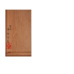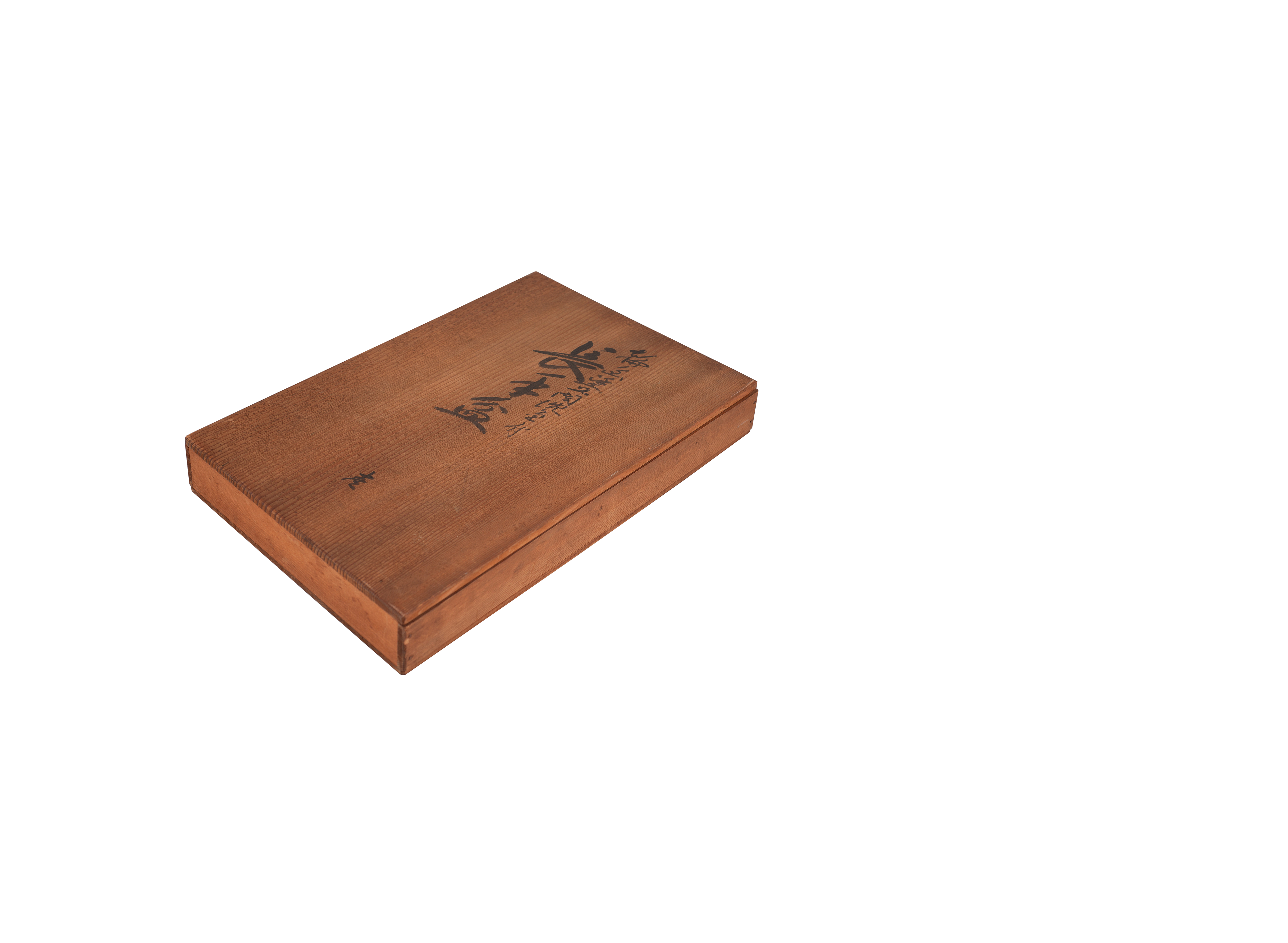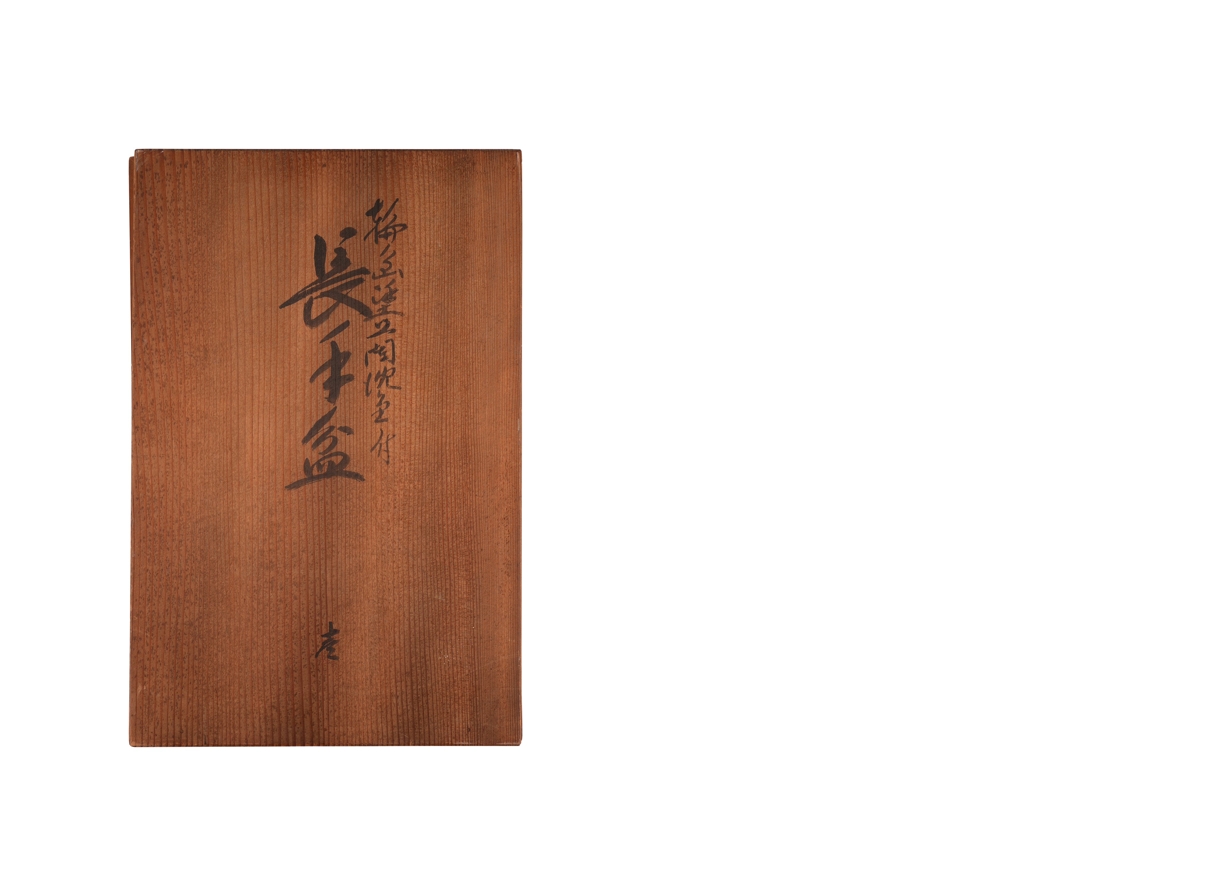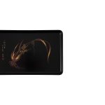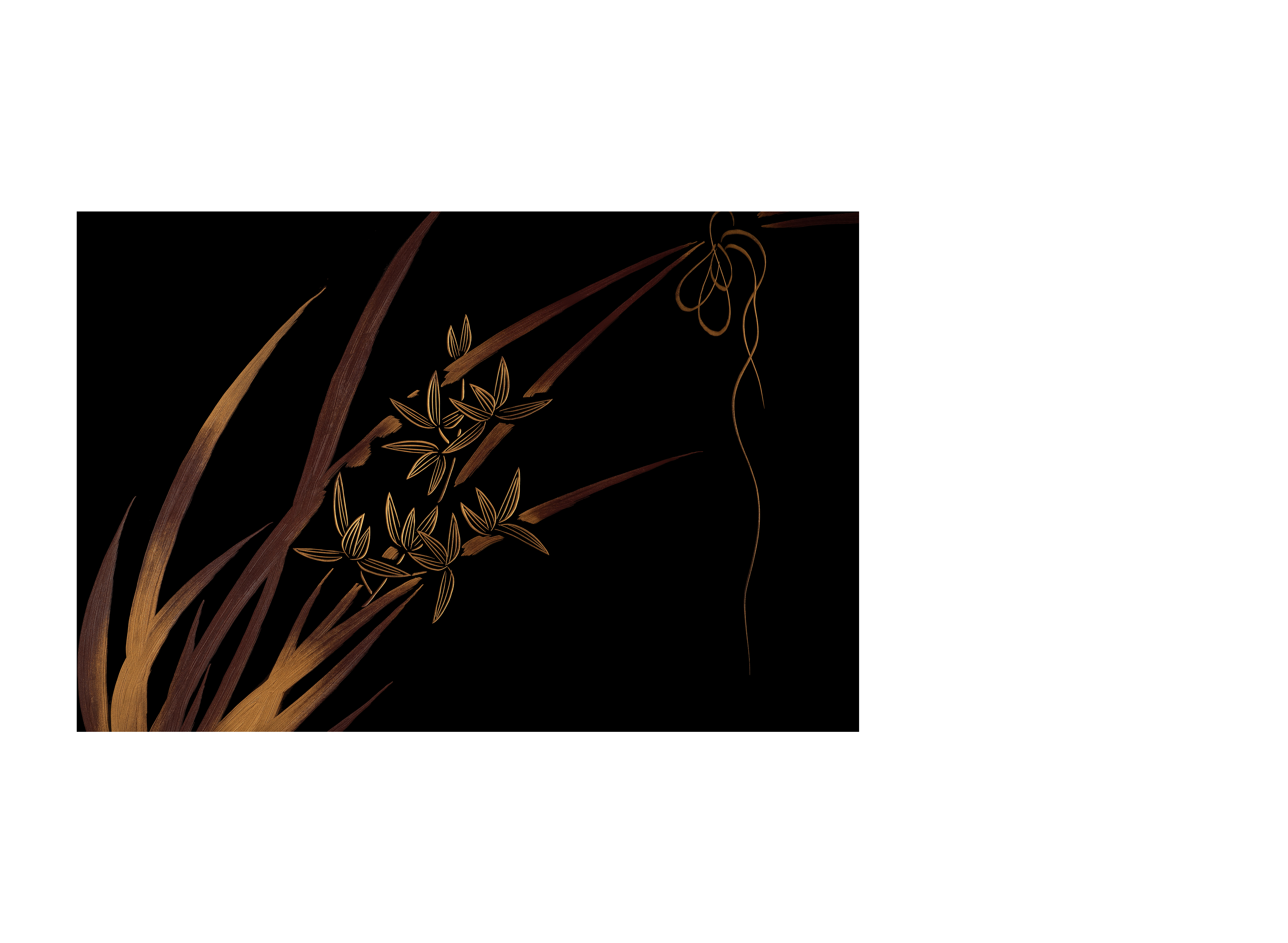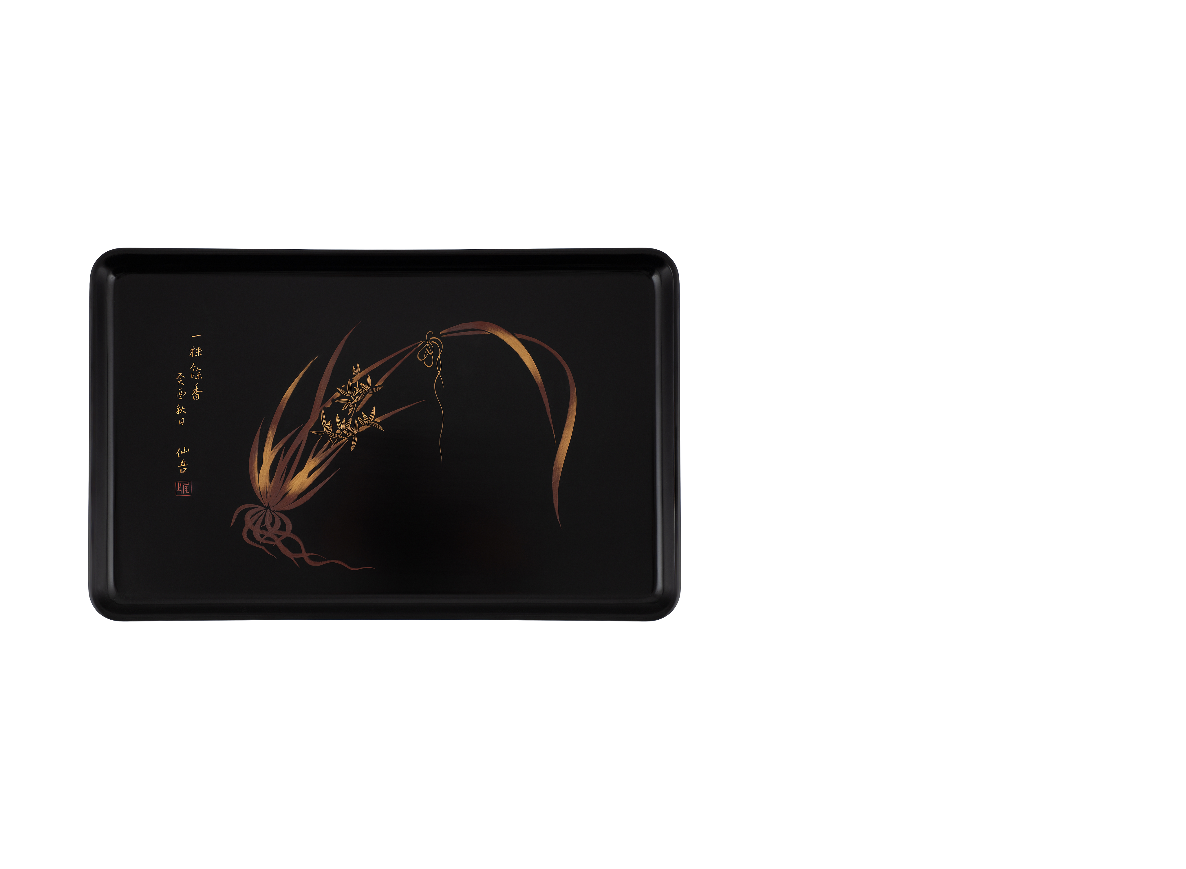 Мастер: Накахама Предмет представляет собой нагатэбон — поднос прямоугольной вытянутой формы. Поднос покрыт черным лаком уруси в стиле вадзима-нури. Декоративный образ в виде стилизованного цветка орхидеи выполнен в технике тинкин – выгравированный рисунок заполняется золотой пудрой. Цветовые градации от янтарно-коричневого в золотистый особенно эффектно выглядят на безупречной поверхности черного лака.