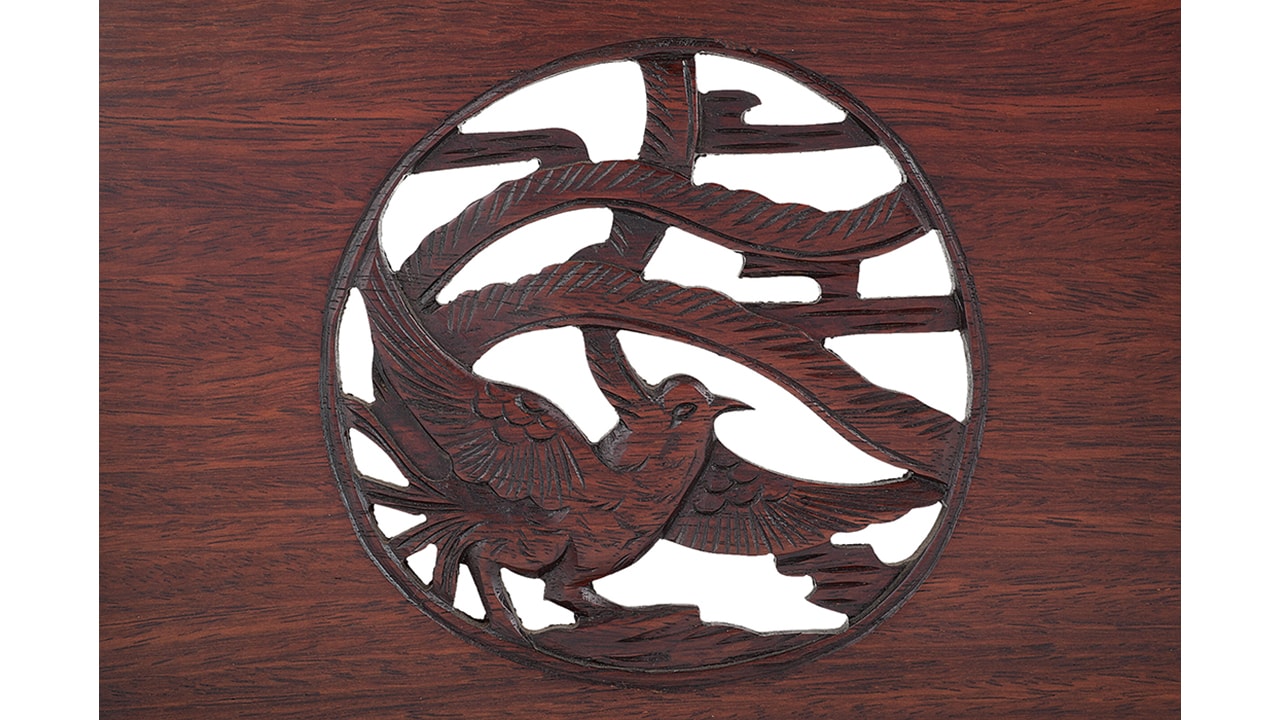Подставка выполнена из дерева и покрыта лаком. Красивый дизайн подставки с использованием разноуровневых панно с изображением птиц Хоо в технике сквозной резьбы, помещенных в круглые медальоны. Вероятно, дизайн подставки повторяет японскую ширму. Подставка, предположительно, принадлежала человеку из известного отряда «Синсэнгуми», которых называли «Волки Нибу».