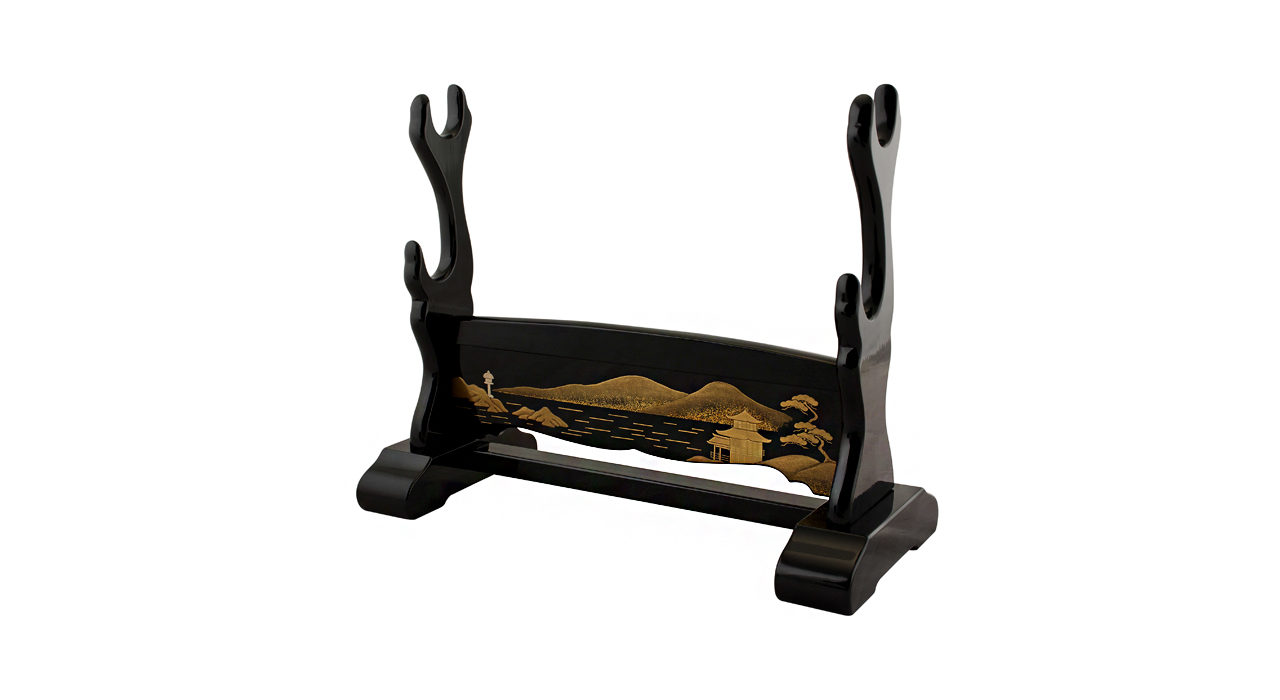 Подставка предназначена для демонстрации мечей. Подставка имеет по две фигурных выемки с боковых сторон, в которые устанавливается пара мечей дайсё. Катана-какэ (подставка под меч) имеет лаконичный дизайн, покрыта черным лаком уруси.