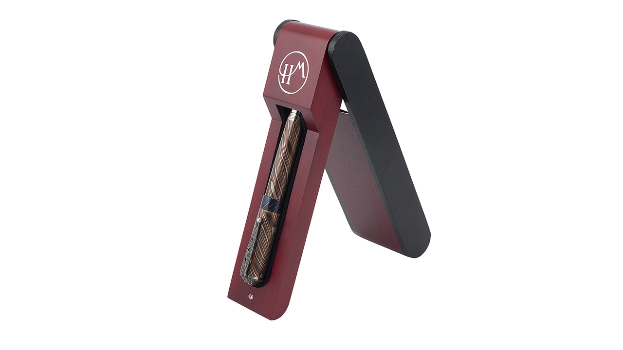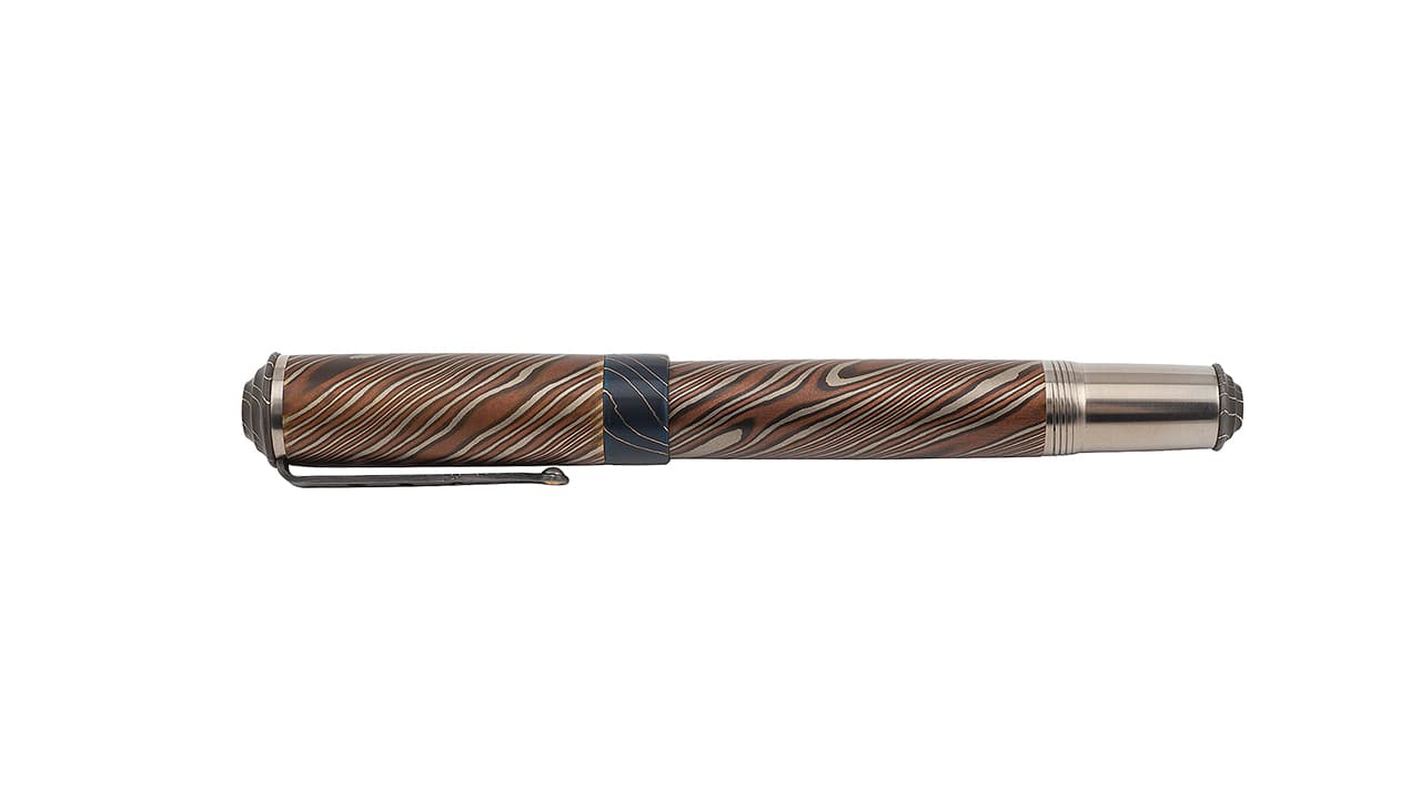 Декоративные атрибуты выполнены в технике крученого дамаска. Карманный зажим ручки, стилус и окончание корпуса выполнены из нержавеющей стали.