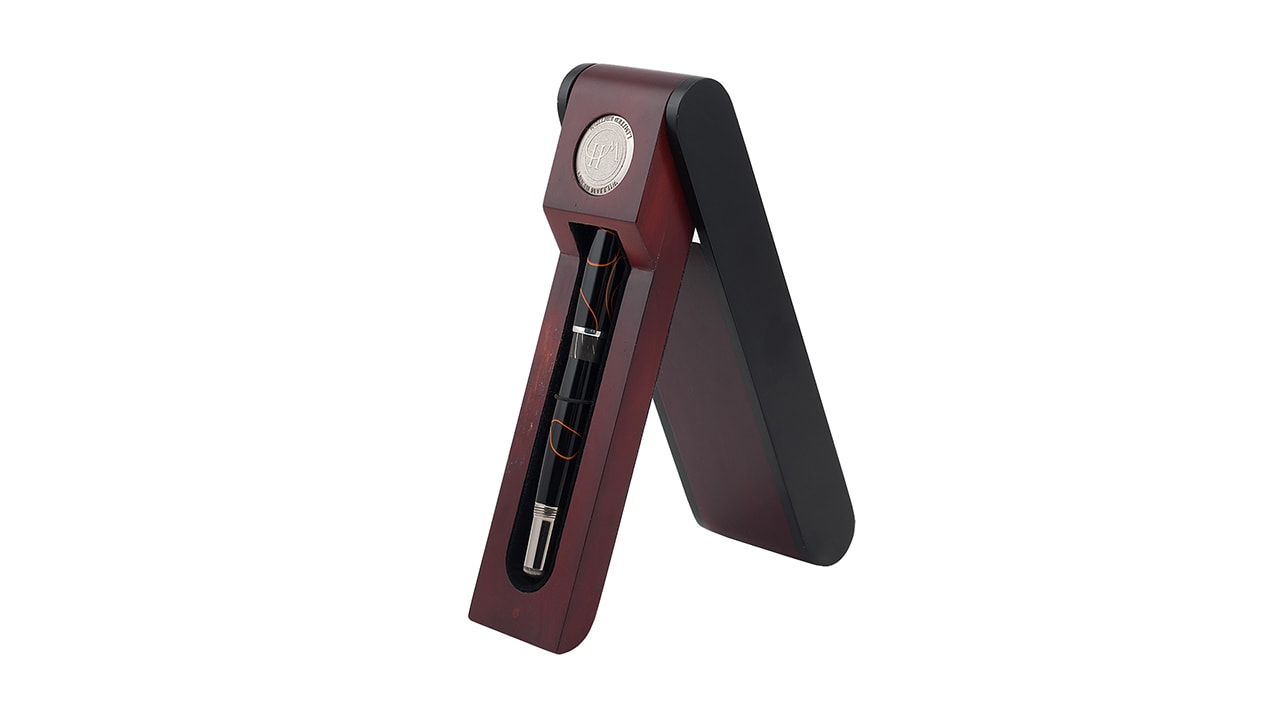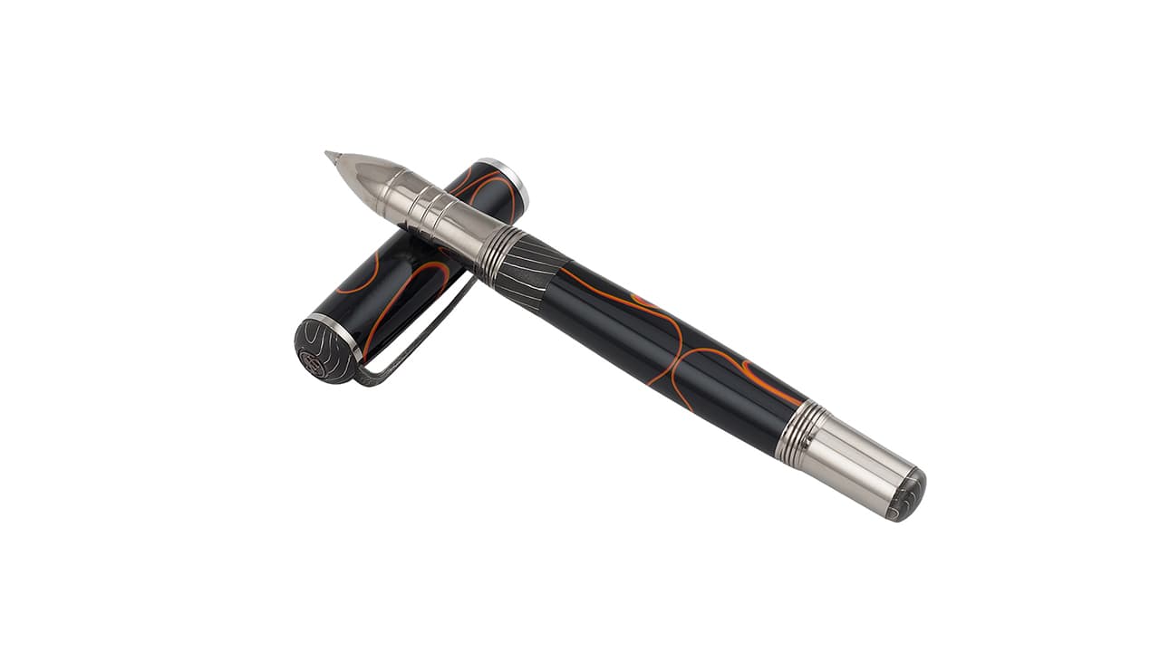 Корпус и колпачок ручки-роллера — чёрно-оранжевый акриловый ацетат.