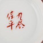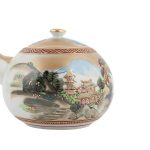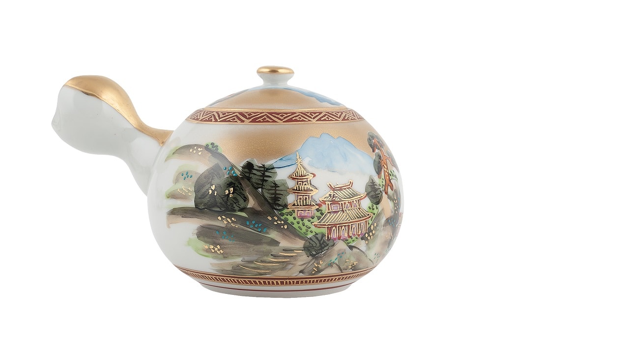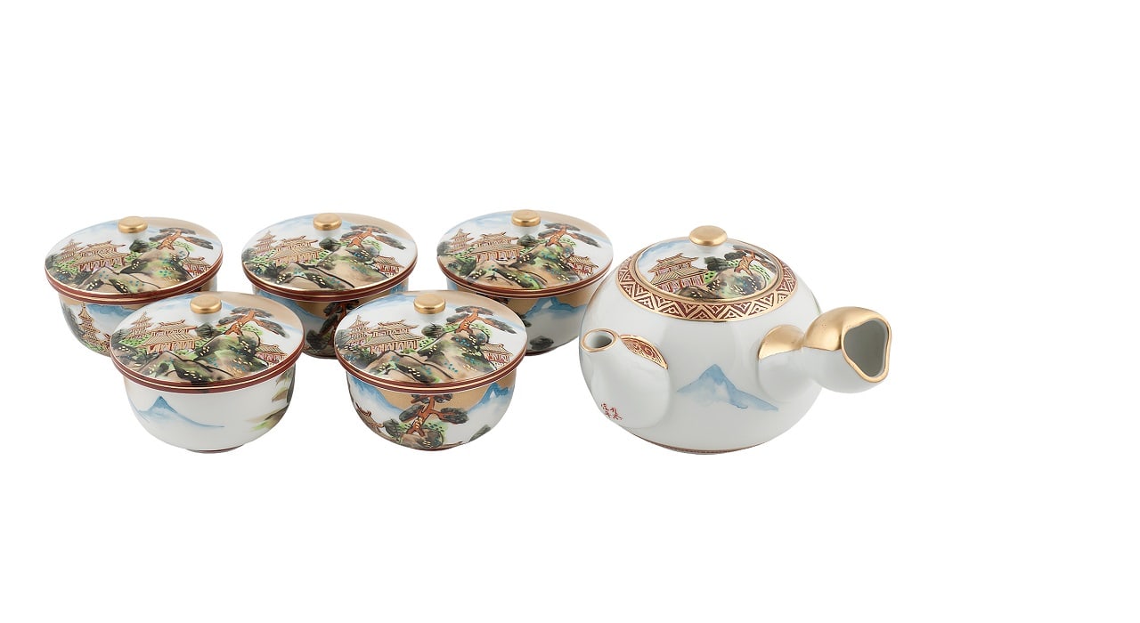 На каждом предмете сервиза с помощью надглазурной росписи изображен пейзаж с буддийским храмом в горах.