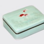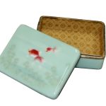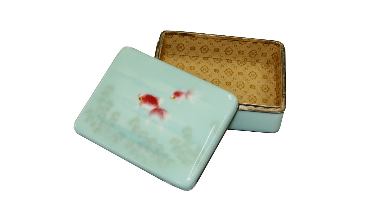 Шкатулка прямоугольной формы выполнена из металла и декорирована полихромными эмалями с изображением «золотых рыбок» в технике бесперегородчатой (беспроволочной) эмали. Золотые рыбки – традиционный сюжет в Японии. Также «играющие рыбки были идеальным сюжетом для японских эмальеров, стремившихся продемонстрировать свои виртуозные возможности» (Х. Уильямс «Эмали мира 1700-2000: из коллекции Халили», СПб, 2009). Для достижения достоверности изображения использованы такие технические приёмы как применение эмалей разной степени прозрачности и разной степени полировки, применение авантюриновой эмали с включением золотой пудры. В результате достигнута виртуозная акварельная лёгкость изображения, тающие контуры рисунка. Внутренняя поверхность обтянута золотистой тканью с тканым орнаментом, подчёркивающей холодный цвет фоновой эмали и золотые включения в авантюриновую эмаль. В комплекте имеется современная коробка.