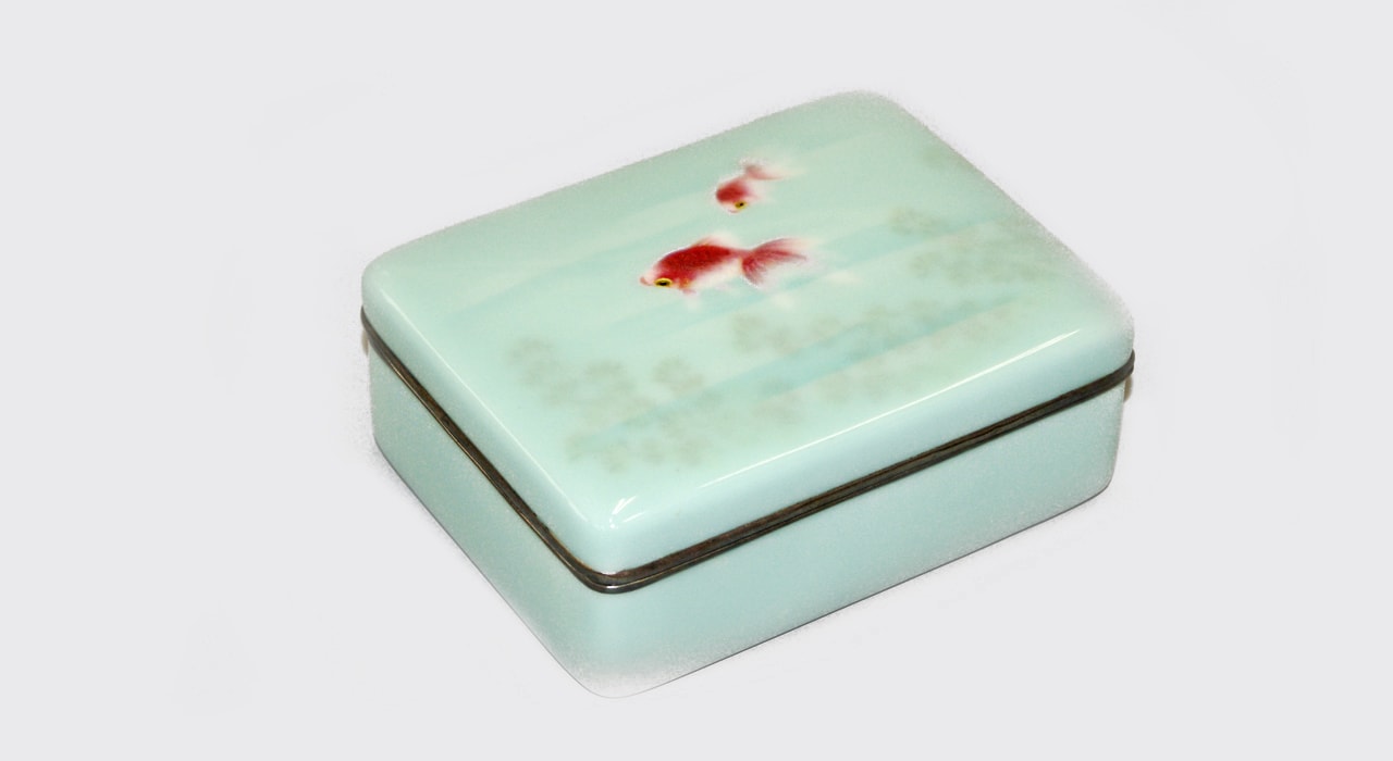 Шкатулка прямоугольной формы выполнена из металла и декорирована полихромными эмалями с изображением «золотых рыбок» в технике бесперегородчатой (беспроволочной) эмали. Золотые рыбки – традиционный сюжет в Японии. Также «играющие рыбки были идеальным сюжетом для японских эмальеров, стремившихся продемонстрировать свои виртуозные возможности» (Х. Уильямс «Эмали мира 1700-2000: из коллекции Халили», СПб, 2009). Для достижения достоверности изображения использованы такие технические приёмы как применение эмалей разной степени прозрачности
