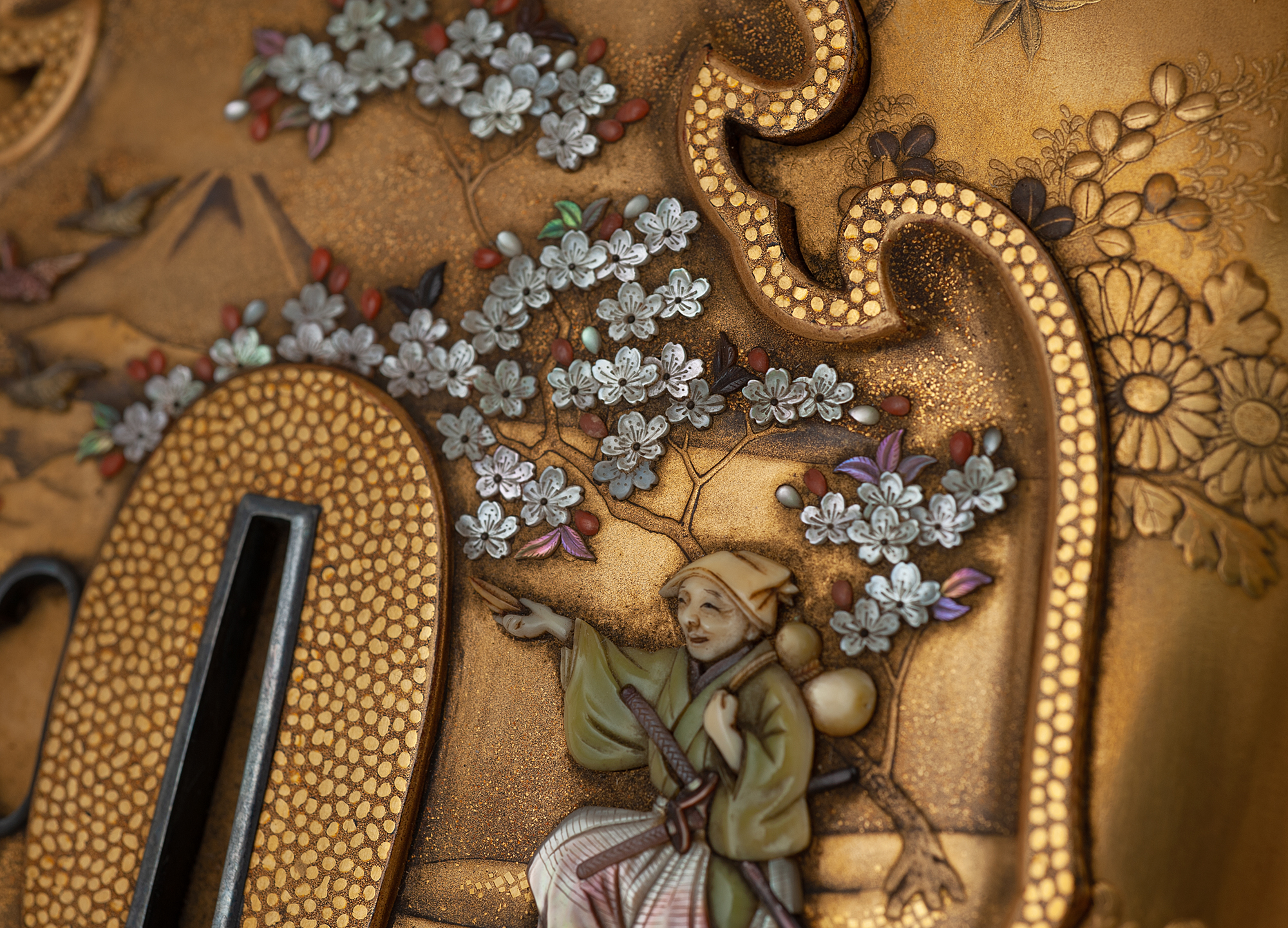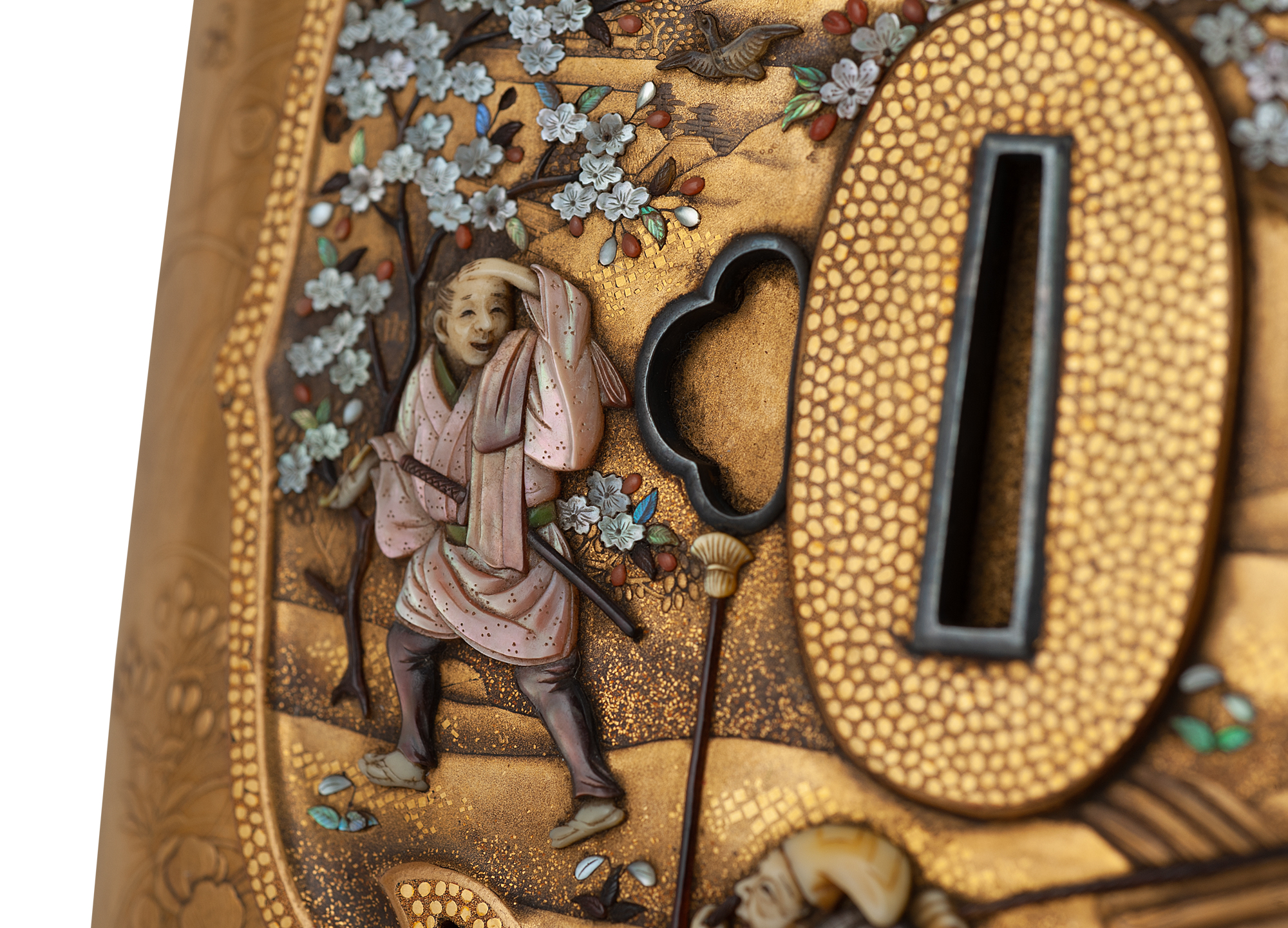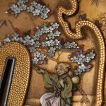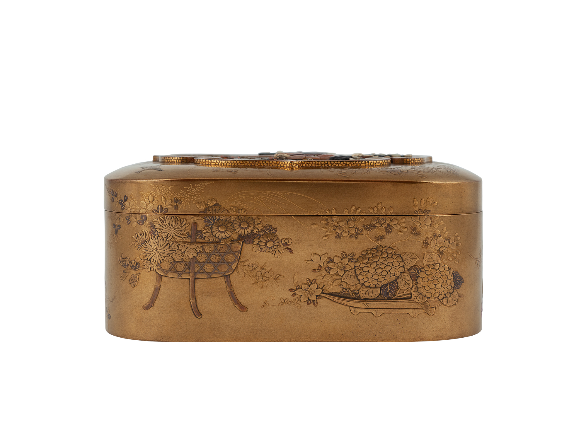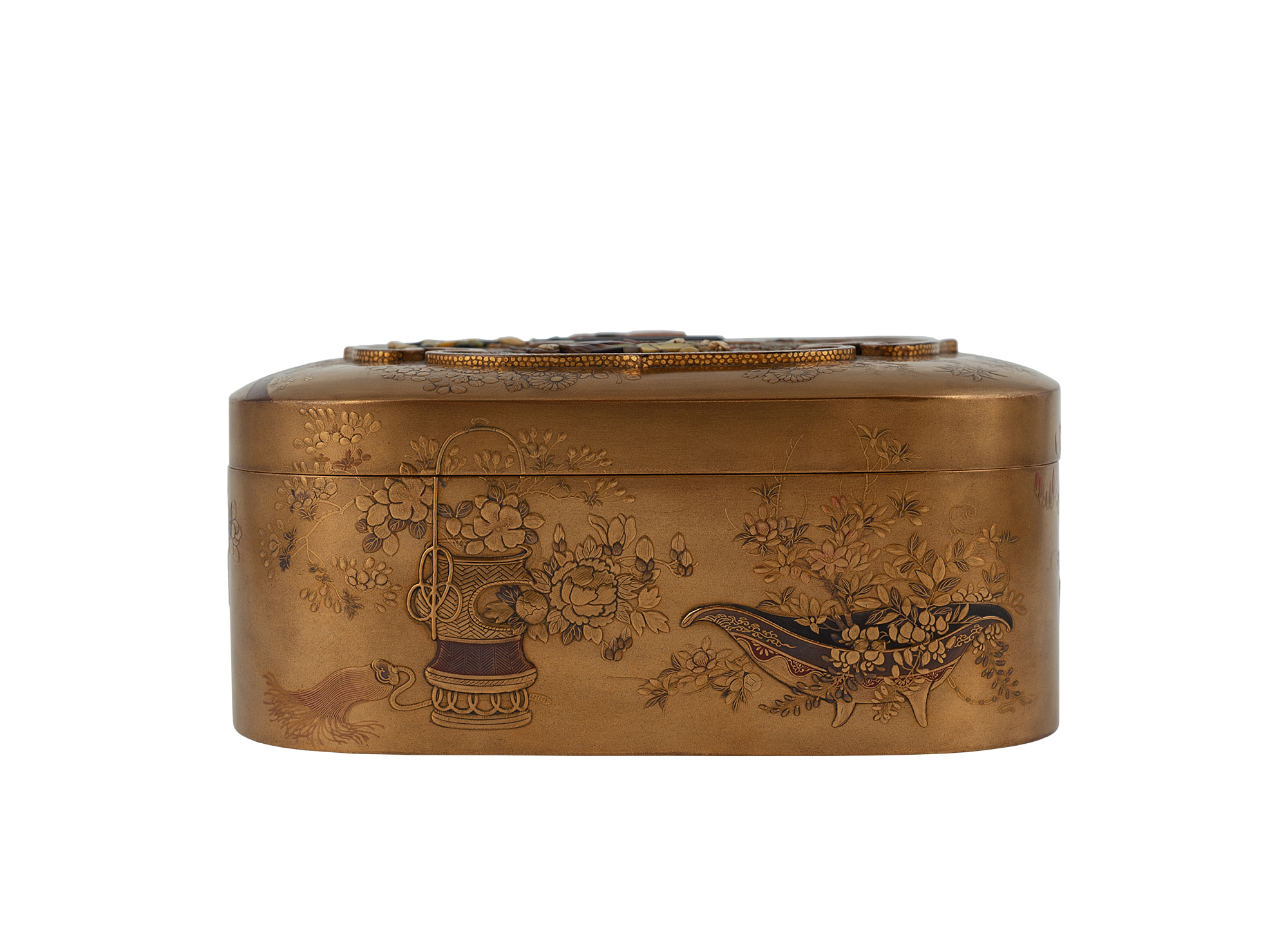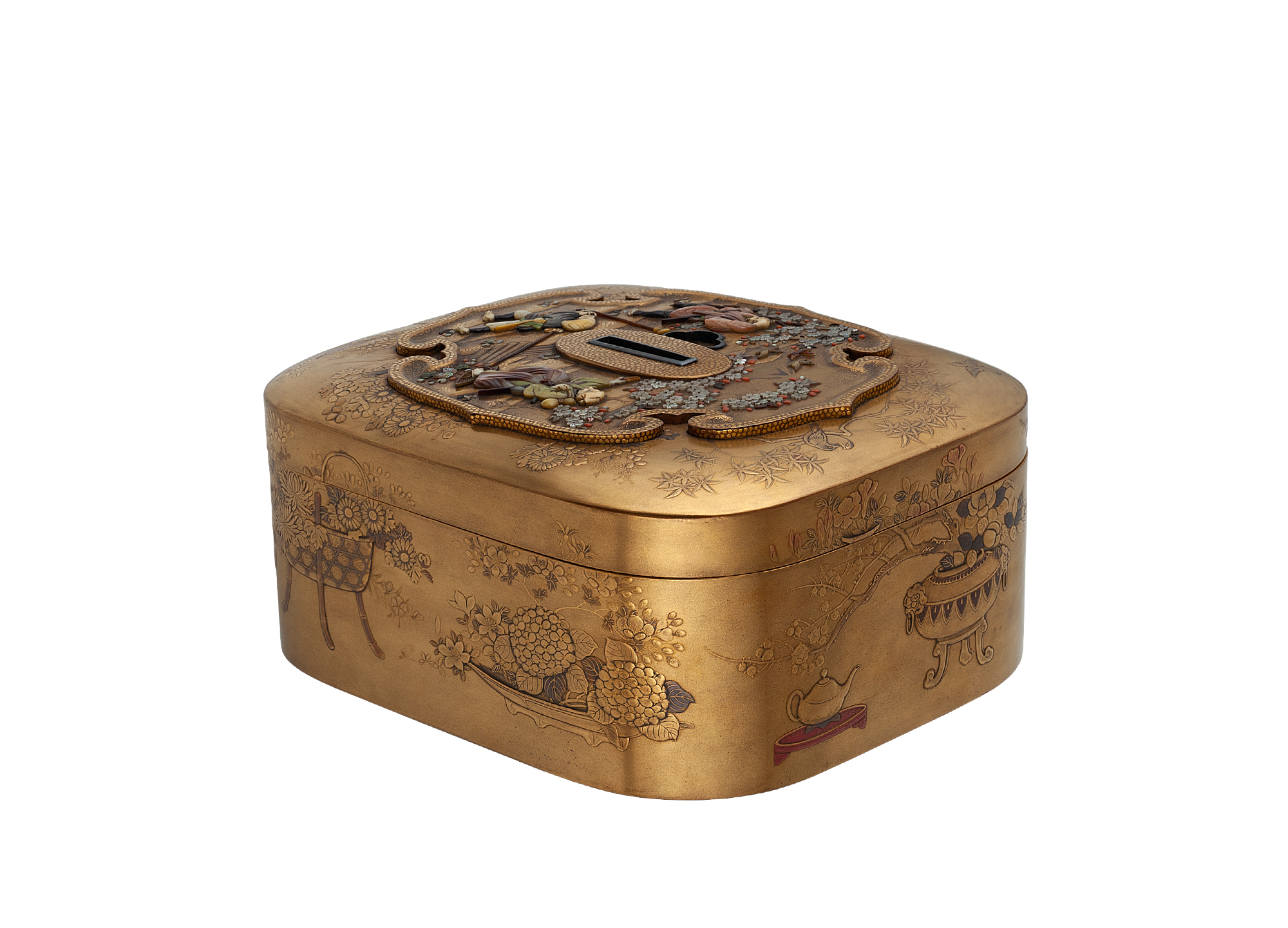 Шкатулка декорирована высоким рельефом в виде цуба. Декоративное оформление составляют излюбленные сцены народной жизни, выполненные в технике инкрустации Сибаяма. С ювелирной точностью и мастерством инкрустированы детали одежды и пейзажа. Боковые стороны шкатулки также украшены рельефными образами птиц и цветущих деревьев, которые в совокупности отсылают к идее изобилия, процветания и благополучия. Вместе с тем мастером показаны и опавшие лепестки, что символизирует мимолетность и недолговечность красоты. Шкатулка из коллекции KASUGAI отличается высокой художественной ценностью, находится в прекрасной сохранности и представляет высокий коллекционный и музейный интерес.