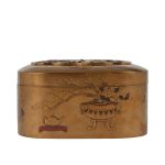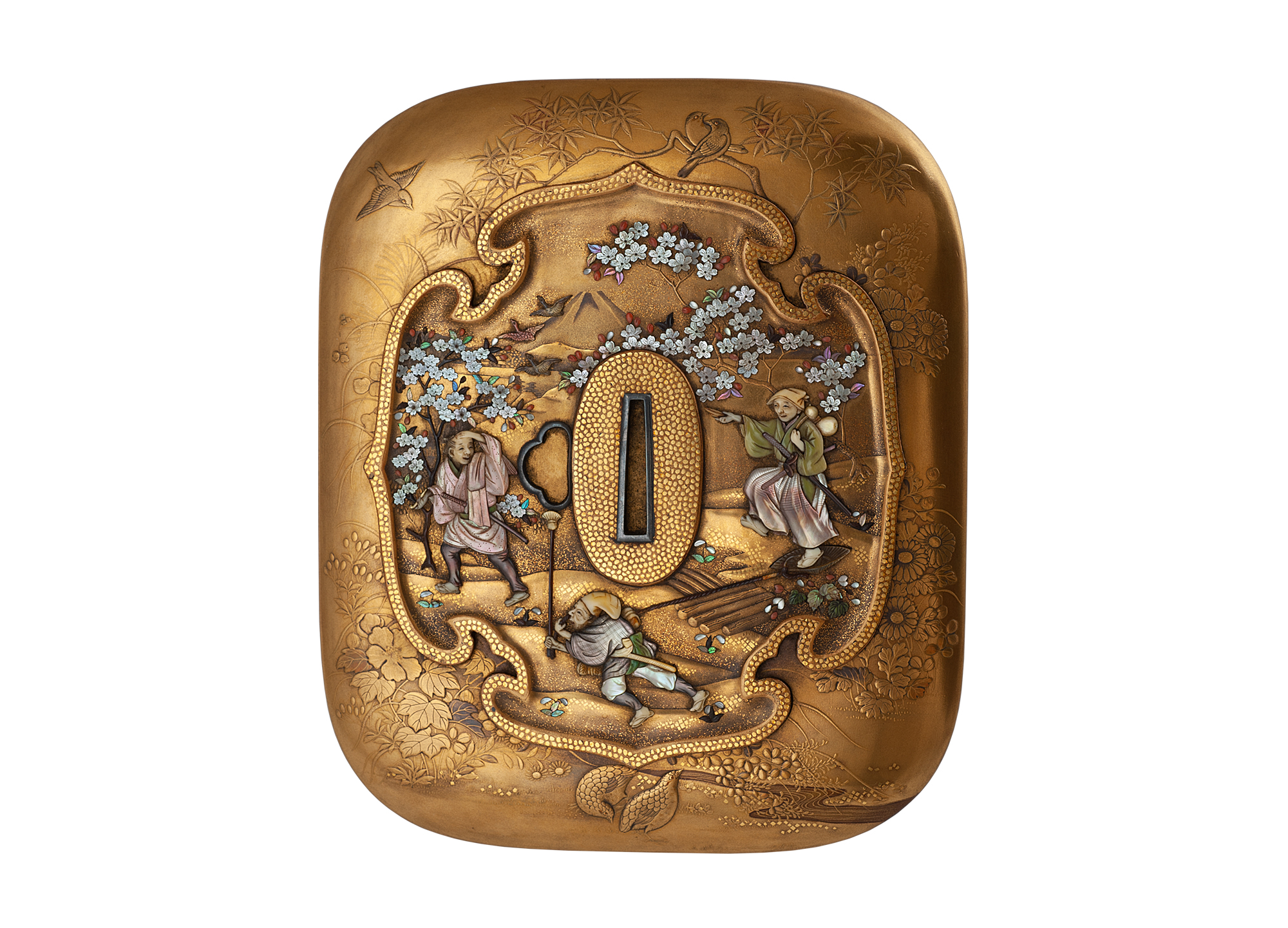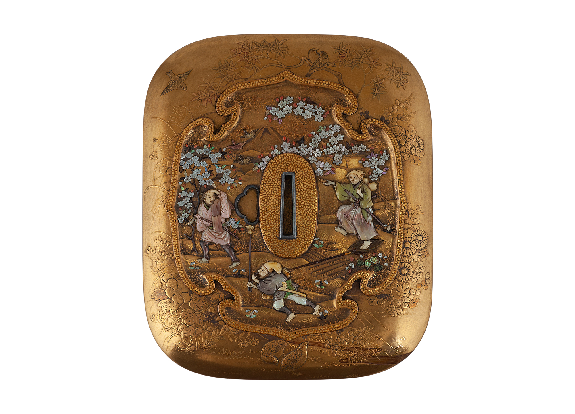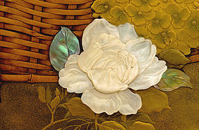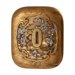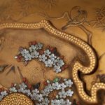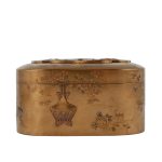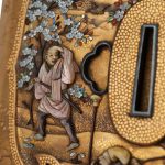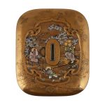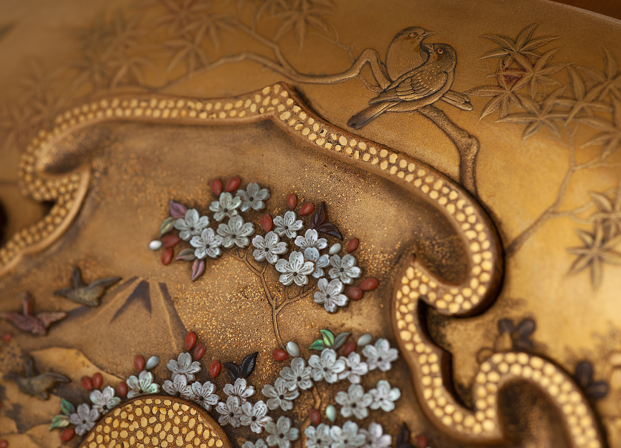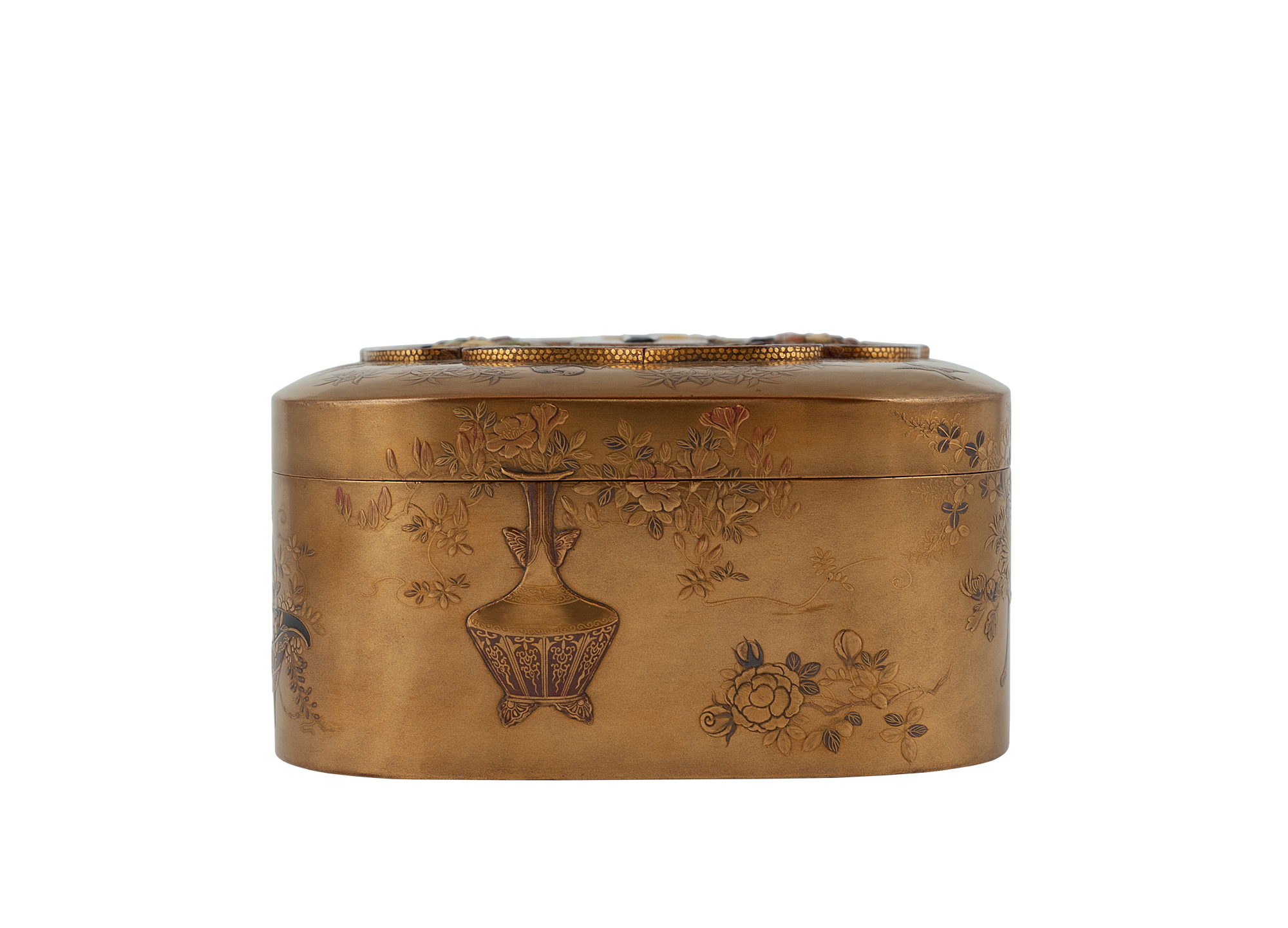 Шкатулка декорирована высоким рельефом в виде цуба. Декоративное оформление составляют излюбленные сцены народной жизни, выполненные в технике инкрустации Сибаяма. С ювелирной точностью и мастерством инкрустированы детали одежды и пейзажа. Боковые стороны шкатулки также украшены рельефными образами птиц и цветущих деревьев, которые в совокупности отсылают к идее изобилия, процветания и благополучия. Вместе с тем мастером показаны и опавшие лепестки, что символизирует мимолетность и недолговечность красоты. Шкатулка из коллекции KASUGAI отличается высокой художественной ценностью, находится в прекрасной сохранности и представляет высокий коллекционный и музейный интерес.