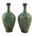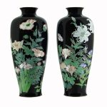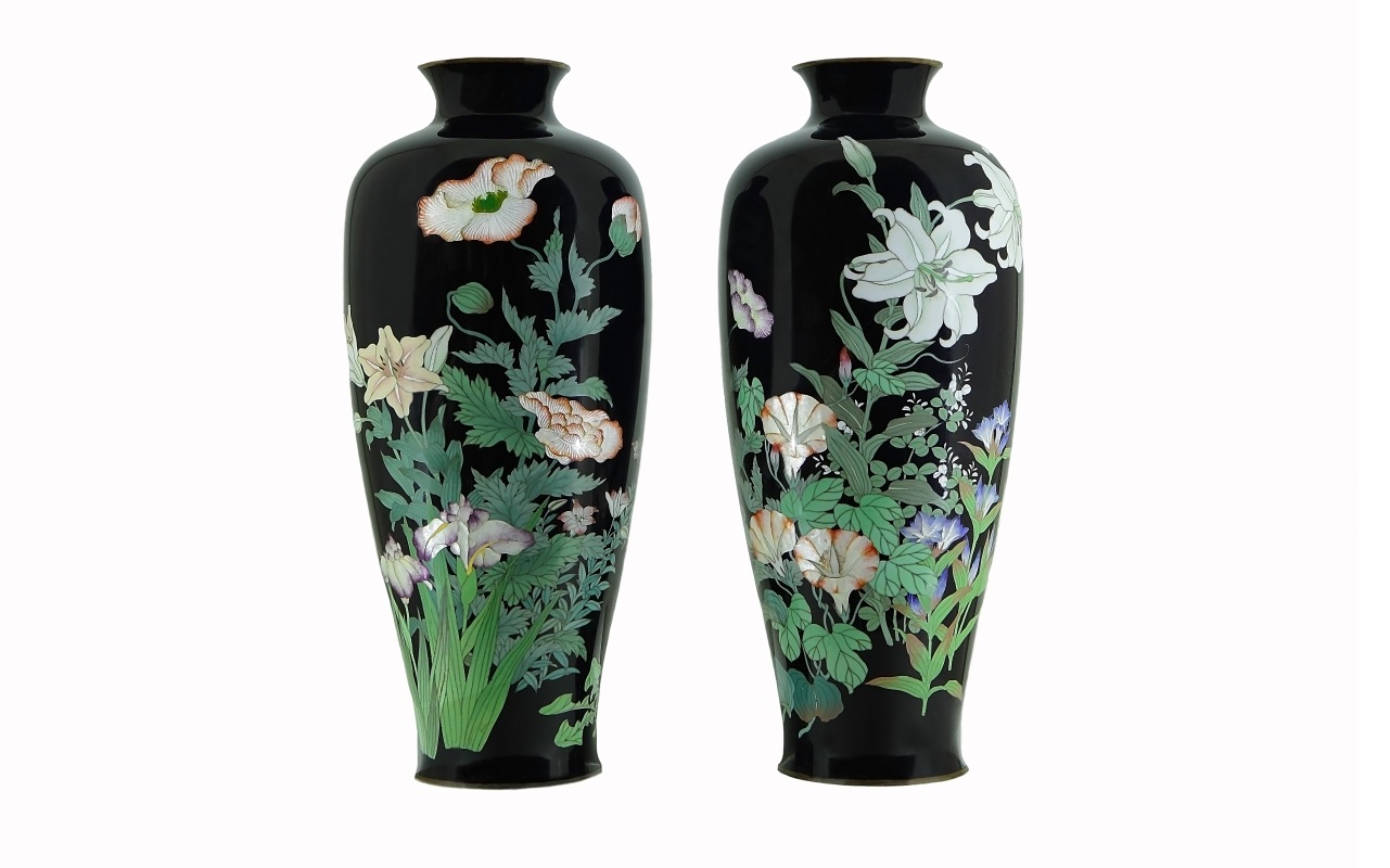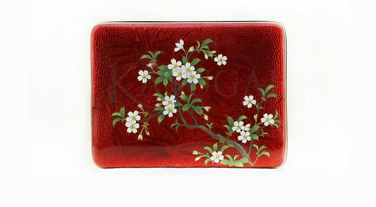 Небольшая шкатулка прямоугольной формы украшена декором в виде ветвей сакуры. Детальность исполнения приближает шкатулку к ювелирному изделию высочайшего класса. Особенность фактуры шкатулки — живописные переходы оттенков красного цвета и эффект объемности изображения. Подобные шкатулки использовались для хранения драгоценностей и мелких вещей. Прозрачная эмаль положена на гильяшированный фон с изображением бамбука. Гильяширование (гравировка по фоновому металлу) позволяет создать визуальный эффект глубины и игры света. Цвет фоновой эмали получил название акасукэ (цвет «голубиной крови»), что подчёркивает ювелирные качества этого материала. «Цветом голубиной крови» традиционно на Востоке и на Западе называли изысканный цвет некоторых наиболее ценных видов рубина из месторождений Индии и Бирмы. На красном фоне в технике перегородчатой эмали изображена ветка цветущей сакуры с зелеными листьями. Внутри шкатулка покрыта фиолетовым шелком с изображением летящих журавлей и хризантем. Использование так называемой «витражной» прозрачной и беспроволочной эмали относит это изделие к лучшим образцам эмальерной работы конца XIX — начала ХХ века.