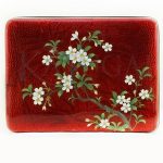 На красном фоне в технике перегородчатой эмали изображена ветка цветущей сакуры с зелеными листьями.