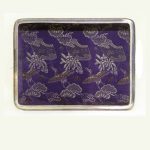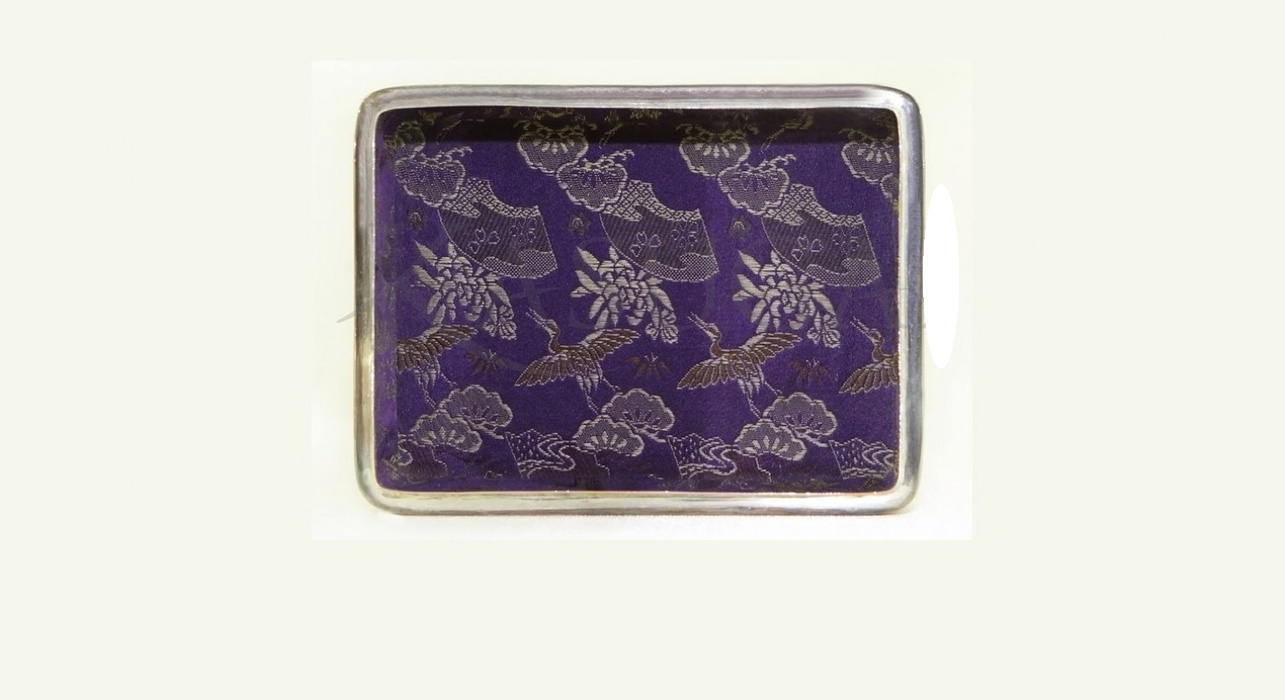 Внутри шкатулка покрыта фиолетовым шелком с изображением летящих журавлей и хризантем.