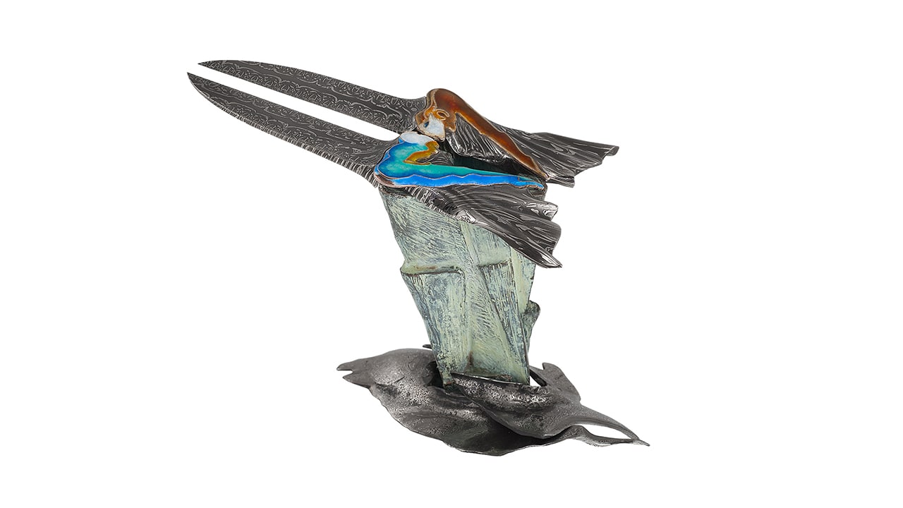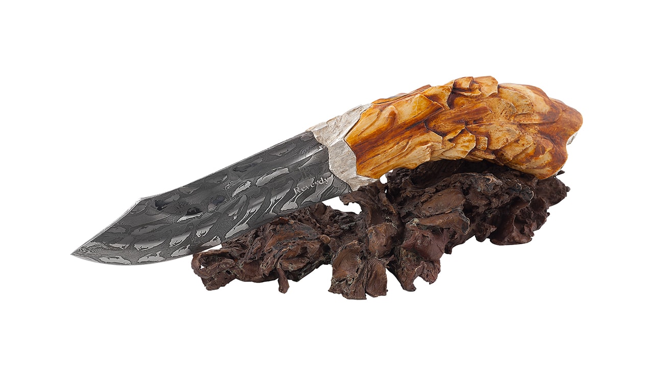 Авторский коллекционный охотничий нож. Клинок формы кхукри со слегка вздёрнутым острием имеет сечение плосковогнутого клина с подводом. Линия среза обуха имеет замысловатый контур. Нож не заточен. Предназначен для экспонирования в качестве ножевой композиции. Клинок изготовлен мастером из авторского поэтического дамаска (le damas poétique), индивидуально разработанного по уникальной технологии, которой владеет только Пьер Реверди. Рисунок переплетения слоёв сталей разворачивает перед взором орнаментальную композицию движущихся кабанов. Обжимное рельефное кольцо из серебра обрамляет клинок и завершает стихийный образ. Рукоять изогнутой эргономичной формы вырезана из клыка африканского кабана — бородавочника оригинальной фактуры с оголением сердцевины кости для достижения декоративного эффекта. Навершие рукояти выполнено из серебра. В комплект входит литая скульптурная демонстрационная подставка из бронзы, поверхность которой искусственно состарена.