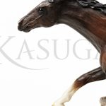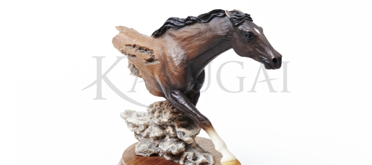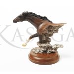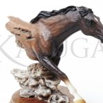 Динамичная статуэтка с фигурой грациозного, резво бегущего коня на деревянной подставке. Конь бежит вперёд так стремительно, словно разрезает пространство.