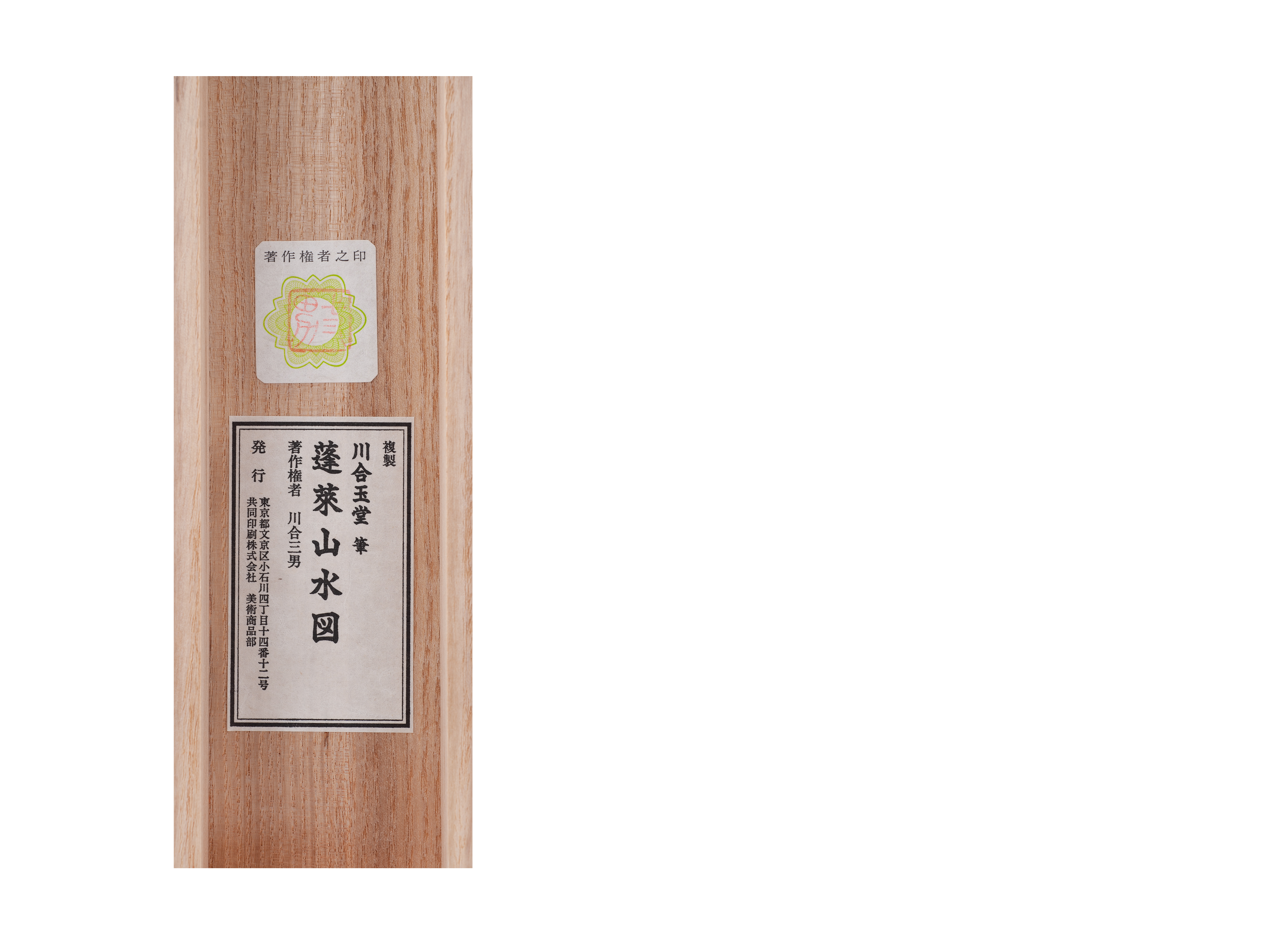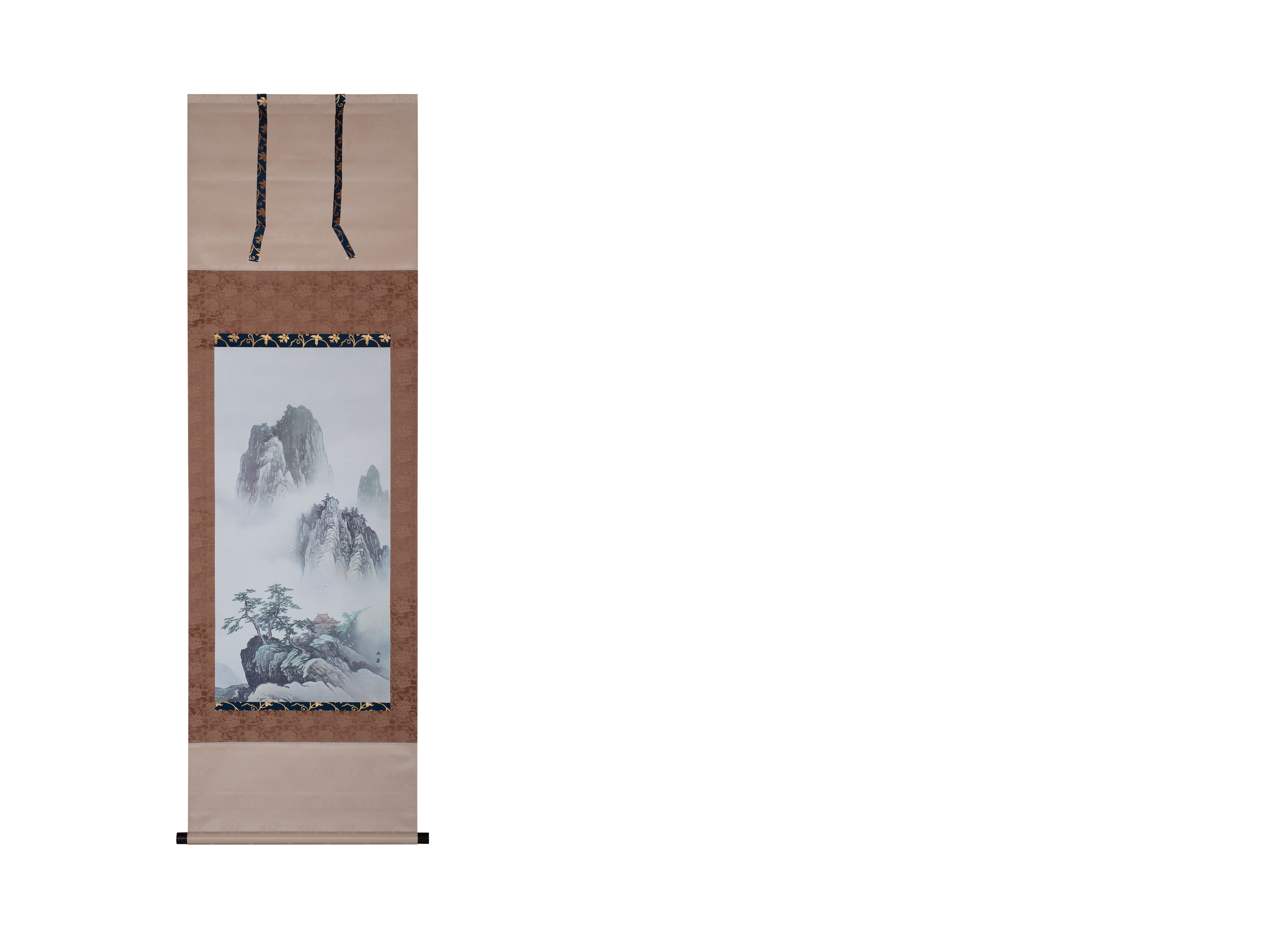 Предмет представляет собой вертикальный подвесной свиток какэмоно с изображением священной горы Пэнлай (или Хорай). Образ выполнен в технике печати по образцу работы известного мастера нихонга — Каваи Гёкудо (1873-1957).