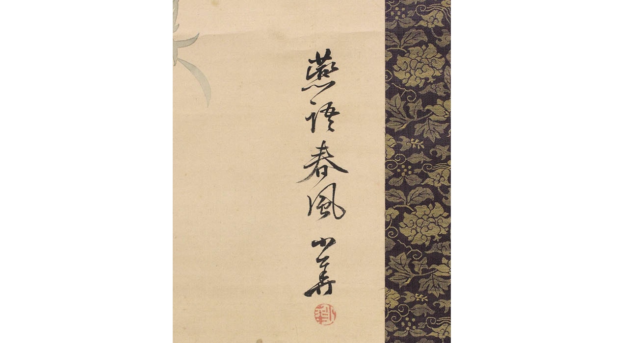 На свитке вертикального формата изображены ласточки, порхающие в небе на фоне цветущих ветвей сливы. Свиток выполнен в стиле традиционной японской живописи. В правом нижнем углу имеется печать и подпись мастера иероглифами.