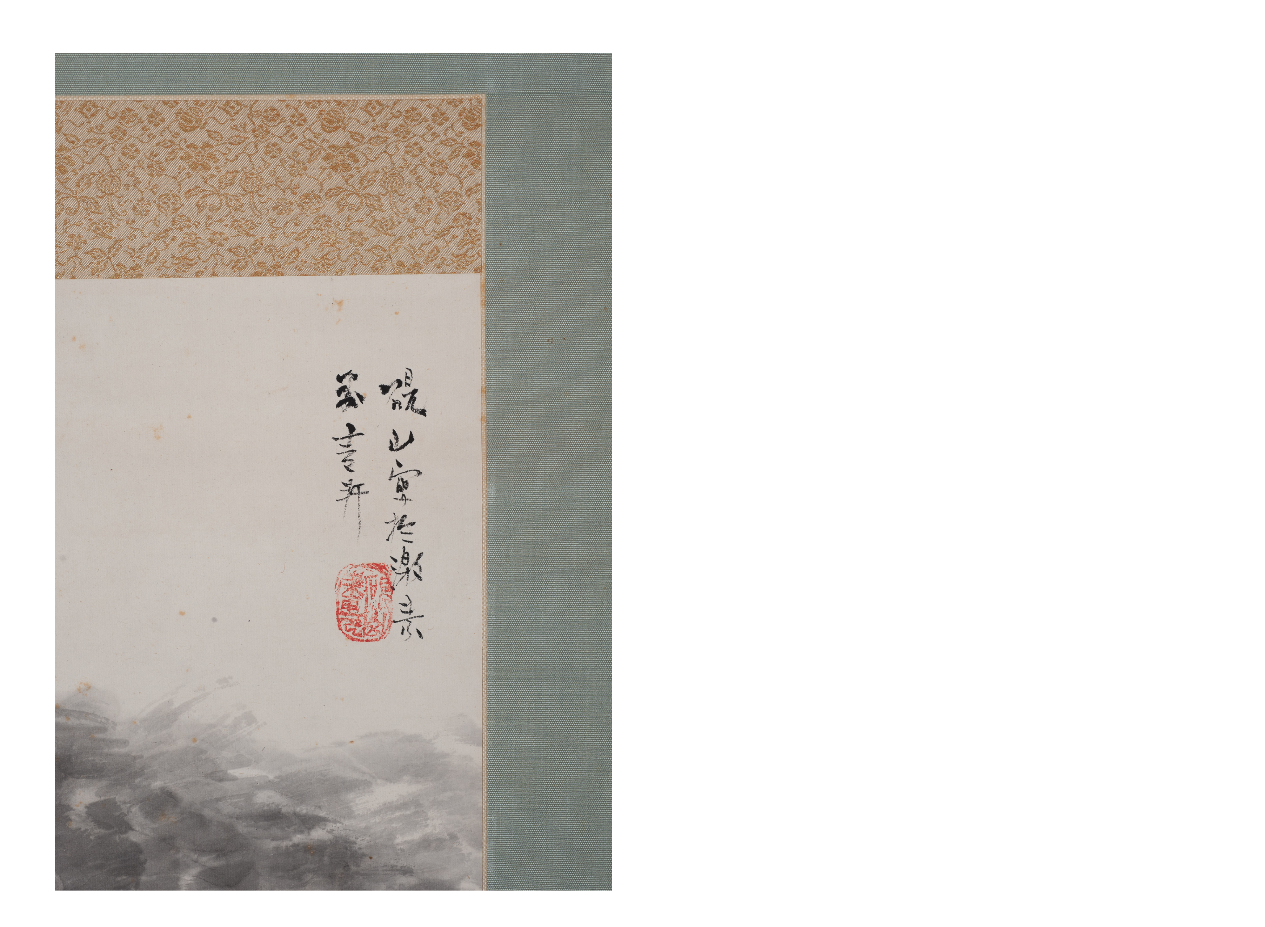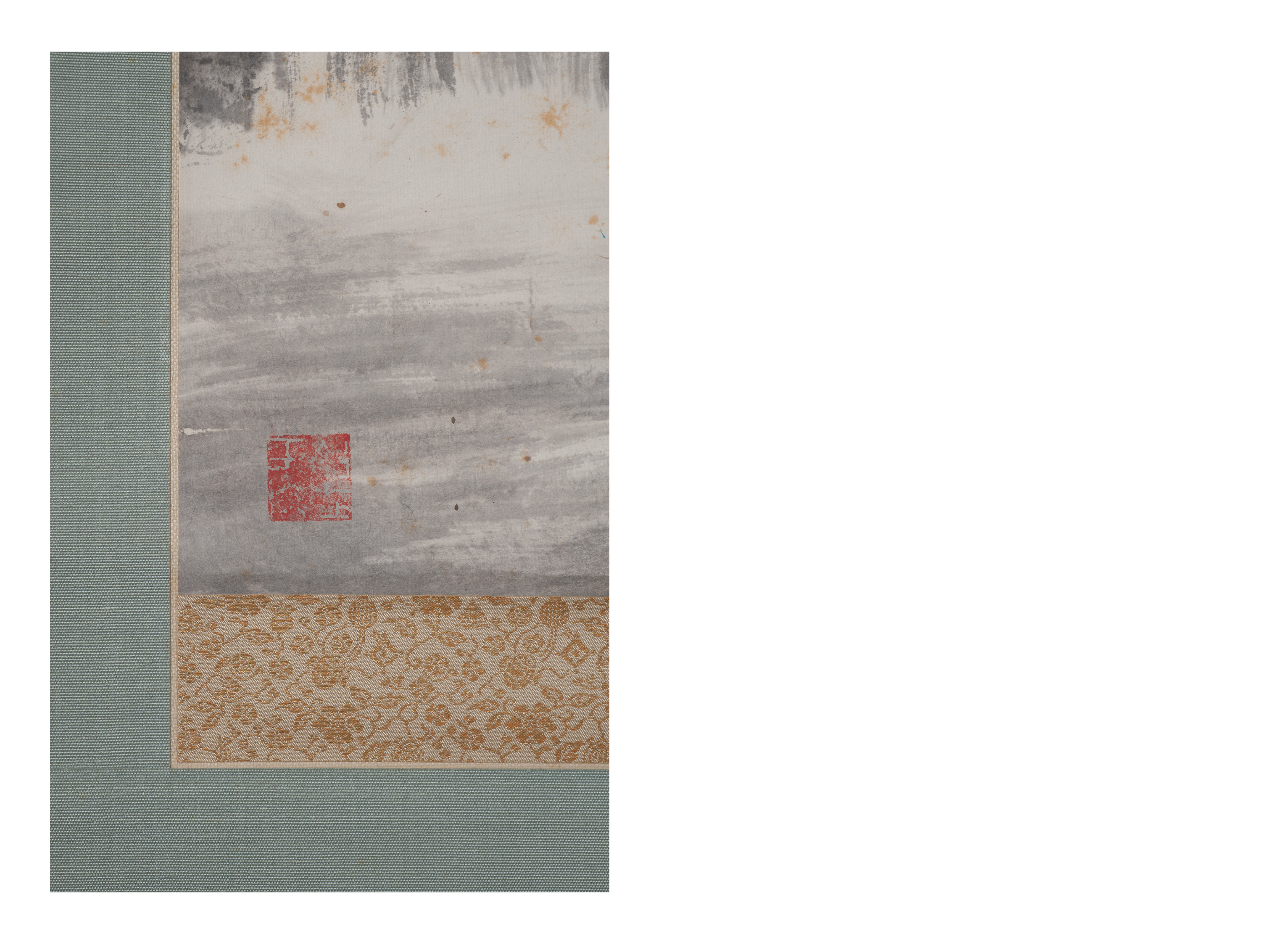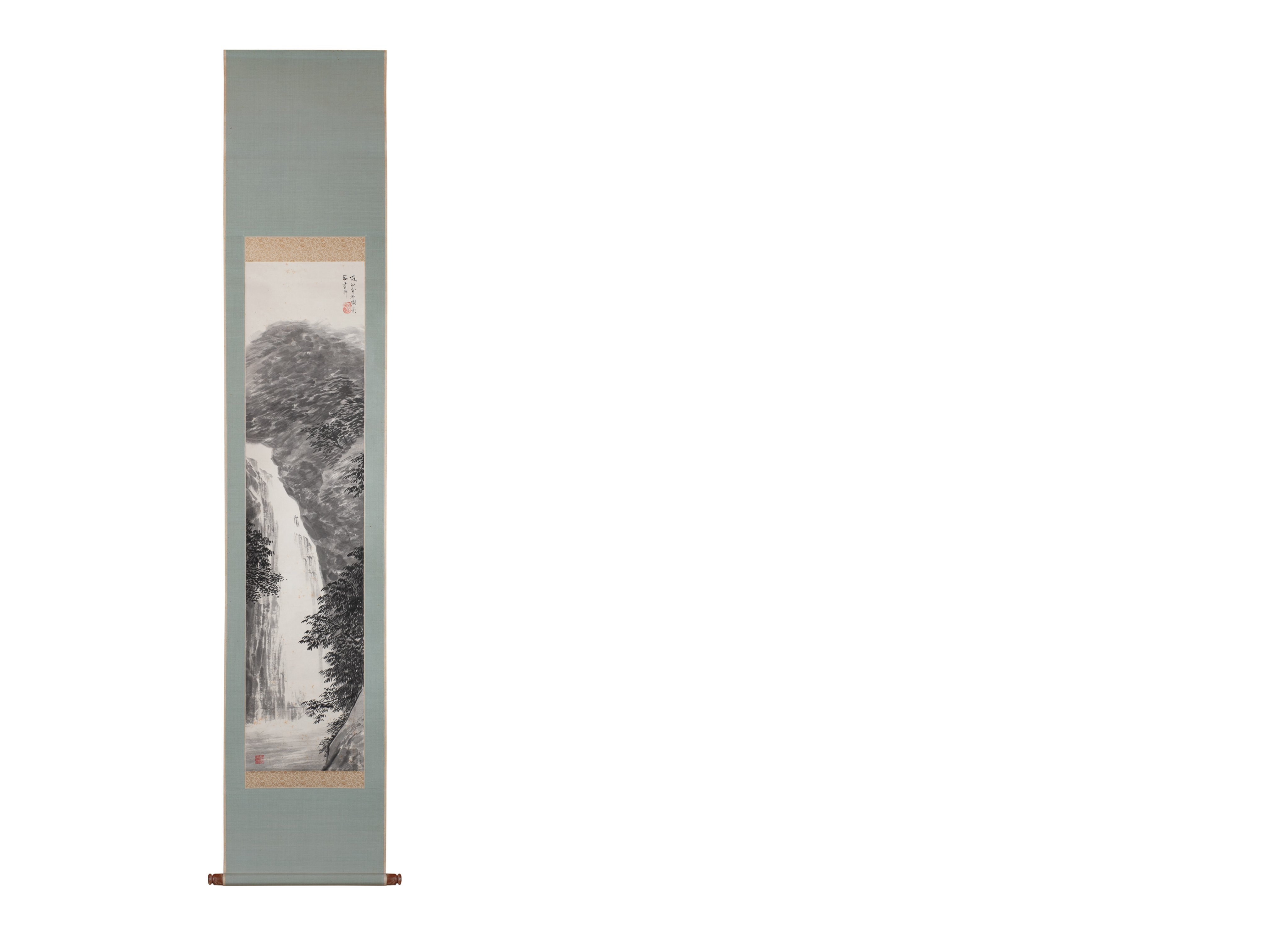 Мастер: Норо Кайсэки Предмет представляет собой вертикальный подвесной свиток какэмоно. Живопись выполнена в технике суйбоку-га или суми-э, что можно перевести как «картины тушью и водой». С помощью энергичных движений кистью мастером был создан образ горного водопада, мощные потоки воды которого стремительно обрушиваются вниз.
