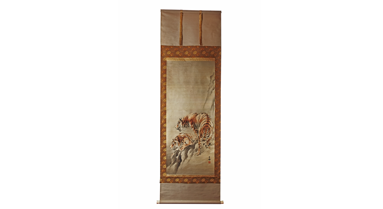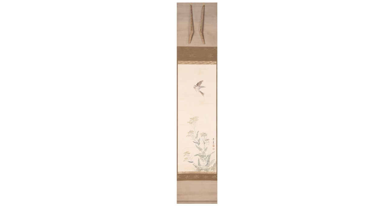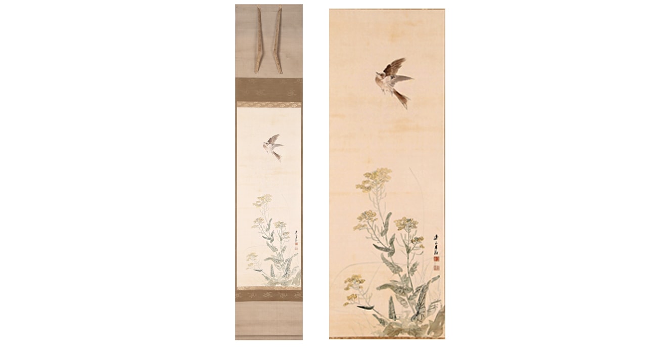Вертикальный свиток с изображением цветов и воробьев выполнен в традиционно японской живописной манере. В правом нижнем углу имеется печать и подпись мастера иероглифами. Мастер: Киси Рэндзан (Kishi Renzan) Художник конца периода Эдо. Родился в Киото в 1803г. Другое его имя — Сётоку. Учился у мастера Ганку, основателя школы Киси, впоследствии стал его приемным сыном и продолжил развивать школу Киси. С 1823 года художник служил семье принца Арисугава. Стал третьим главой школы Киси, после мастера Гантай. Сначала стиль его живописи был насыщен декоративными элементами, однако в поздние годы, под влиянием школы Сидзё-ха, живопись мастера стала более мягкой и спокойной. При нем произошел переход стиля живописи школы Киси к более современному, со все большим использованием зарисовок с натуры. Этот переход продолжился и при преемнике мастера — Тикудо. Киси Рэндзан умер в 1859 году в возрасте 56 лет.