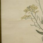 Вертикальный свиток с изображением цветов и воробьев выполнен в традиционно японской живописной манере. В правом нижнем углу имеется печать и подпись мастера иероглифами.