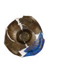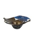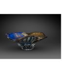 Мастер: Нисинака Юкито Предмет представляет собой образец современного художественного стекла Японии. Форма вазы напоминает собой перевернутую широкополую шляпу, позволяя насладиться игрой света, скользящего по волнам стекла, создающего живую непрерывную игру бликов и рефлексов. В своих работах мастер Нисинака Юкито обращается к технике реставрации кинцуги, суть которой заключается не в сокрытии следов трещин, а в их намеренном обнажении. Бережное отношение к истории бытования вещей, ставшее популярно сегодня, Нисинака Юкито преобразует в идею возрождения. В серии работ «Ёбицуги» (разновидность кинцуги), к которой относится данная ваза, мастер воплотил традиционную философию в относительно новом для японского искусства материале – стекле. Эффект некогда разбитой вазы, собранной воедино из разных фрагментов, достигнут за счет неповторимой техники владения материалом.