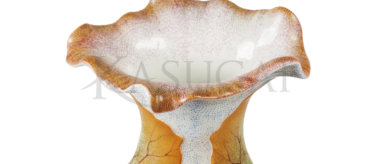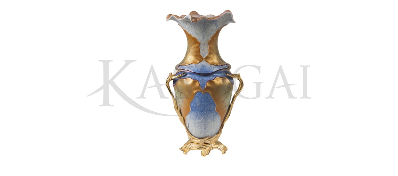 Ваза с широким волнообразным венчиком богато украшена при помощи различных декоративных приемов в лучших традициях стиля барокко. Фарфоровая поверхность тулова покрыта кобальтовым напылением, создающим эффект пастели. Рисунок вазы создают рельефные листья, выделенные красками цвета матовой бронзы с переливами.